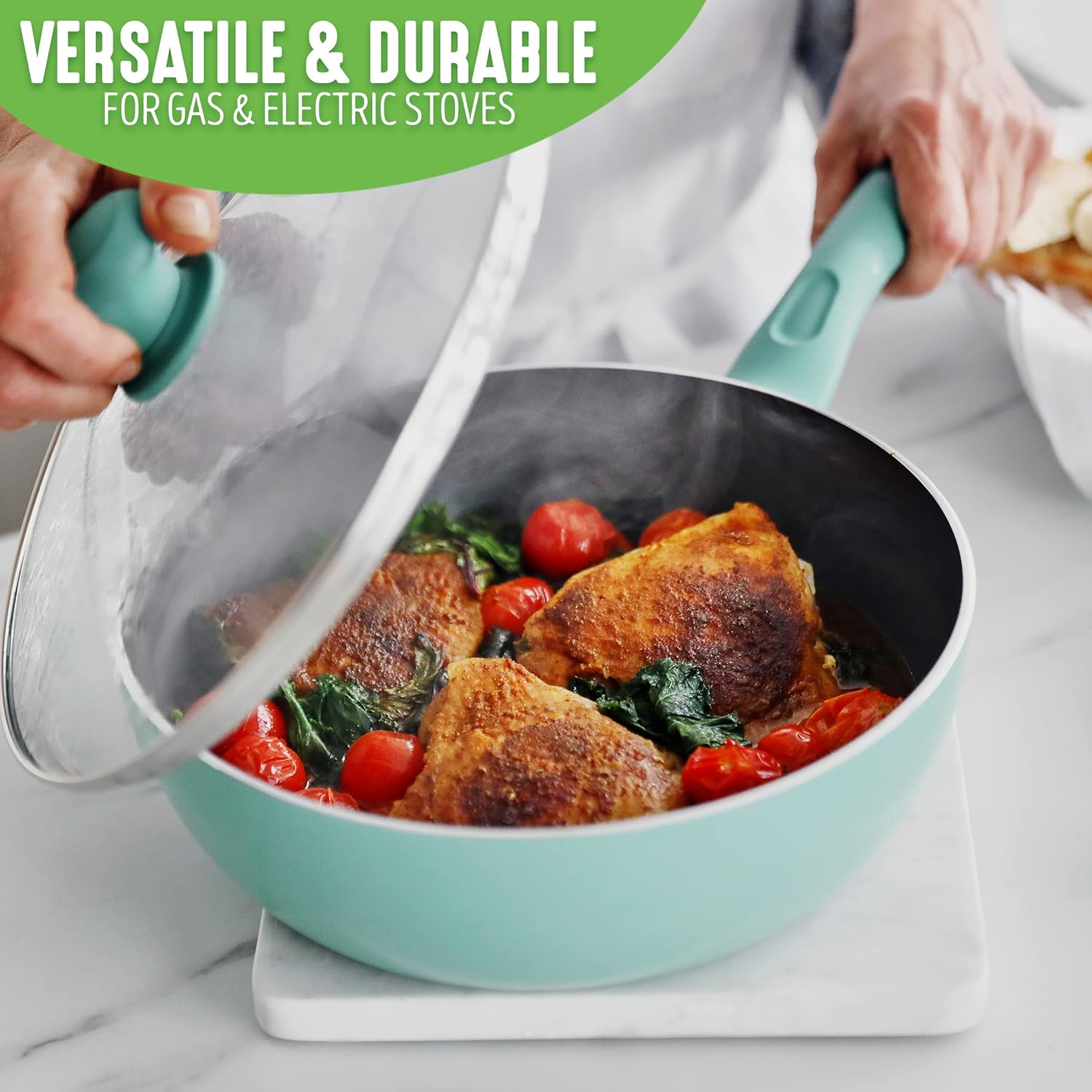 Give a warm welcome to your new stovetop sidekick. A spacious cooking surface offers endless options, from sautés and sears, to low-and-slow braises (all thanks to a glass lid that’ll let you keep an eye on things and seal in moisture, too). Plus, that happy-go-lucky turquoise is sure to be eye-candy wherever it goes. Our Soft Grip Pro collection gives you extra control while cooking thanks to comfy, stay-cool Bakelite handles and a clever thumb divot for easy maneuverability. The best part: our healthy ceramic nonstick coating releases food and wipes clean in seconds, no soaking or scraping required.