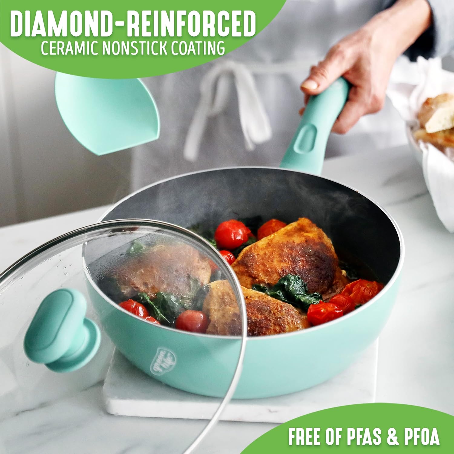 GreenLife Soft Grip Diamond Healthy Ceramic Nonstick, 3QT Chef Saute Pan with Lid, PFAS-Free, Dishwasher Safe, Turquoise