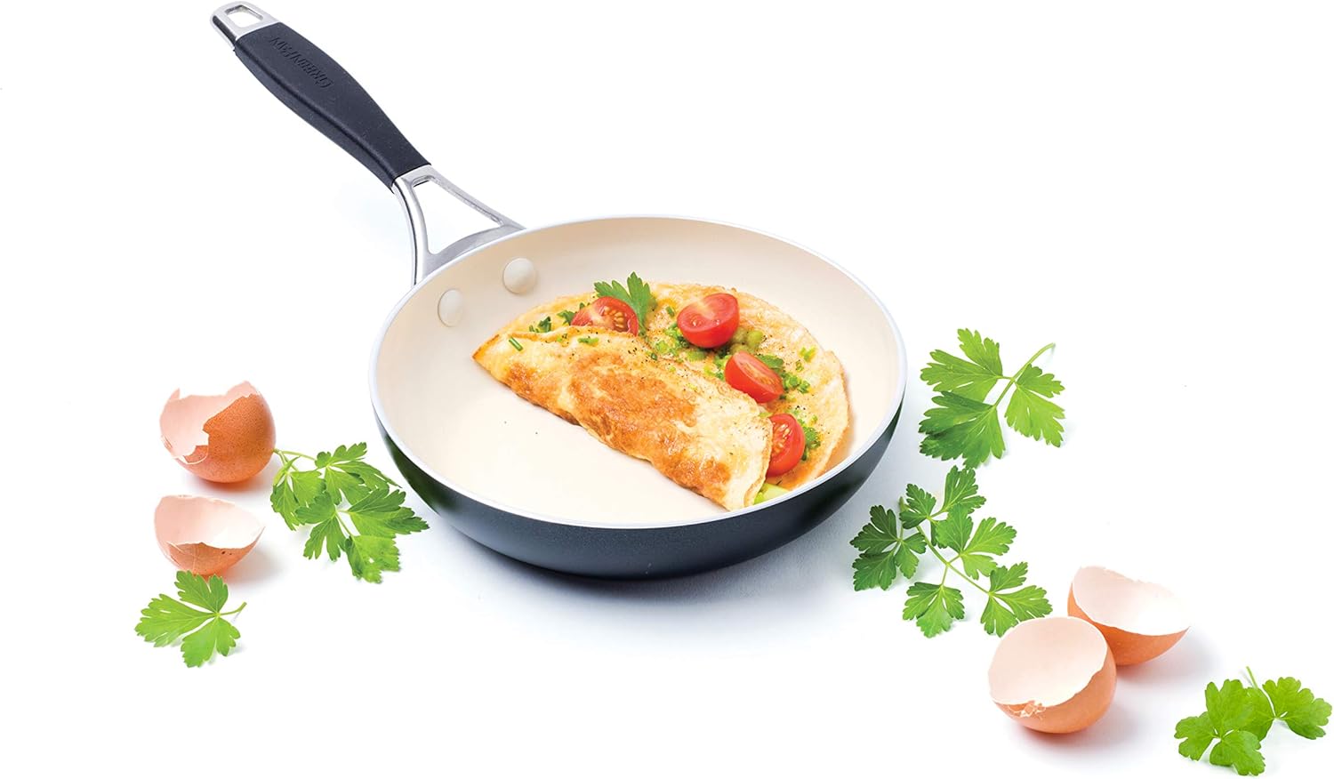 GreenPan is a range of beautifully designed, technologically advanced cookware pieces with a unique environmental message. No PFOA is used in the manufacture of GreenPan. The ceramic non-stick coating Pan contains no PTFE. Less energy used in the manufacturing process and environmentally friendly materials used as much as possible. The ceramic coating is heat resistant to 450°C / 850°F – If you accidentally overheat your pan, no toxic fumes will be released and the coating itself will not be destroyed. It is hard wearing and has excellent food release properties. No more rubbing and scrubbing, clean-up has become a breeze! Thanks to the unique properties of the ceramic non-stick coating, GreenPan cookware makes it possible to prepare meals with less oil. To clean your GreenPan cookware, simply wash in warm soapy water with a soft cloth, rinse and dry with a towel. You can use metal utensils such as spoons and whisks. The use of forks and knives is not recommended, as you can damage the surface of your pan when cutting the food GreenPan is a Belgian Cookware manufacturer which is the first to launch PTFE free non-stick cookware. Our products have truly revolutionised the cookware market. Each of our products makes a serious commitment to your Health, your Convenience and the Environment. High-End materials and the latest state-of-the-art technology make it possible to create unique pieces. Enjoy the new dimension and expand your cooking skills with GreenPan.