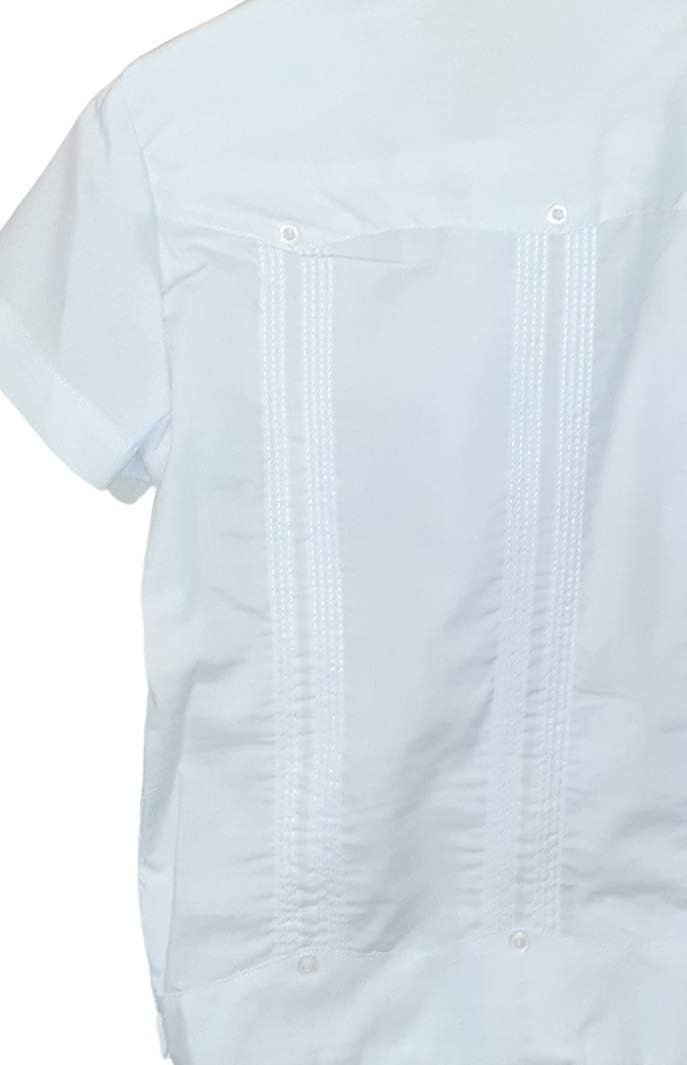 Traditional and classic white cotton button down pleated dress shirt guayabera design for formal or casual occasions in short sleeve or long sleeve styles for kids or young boys.