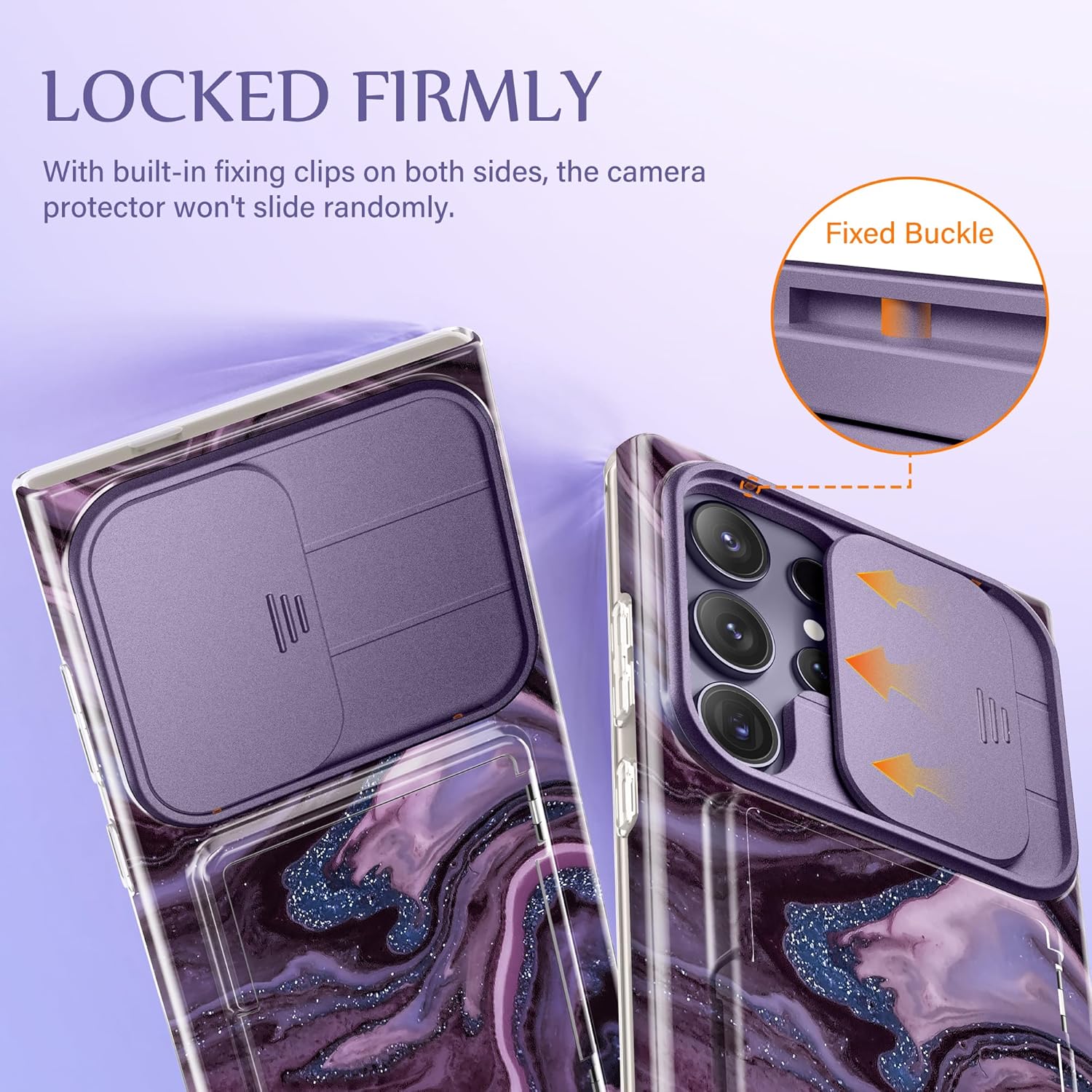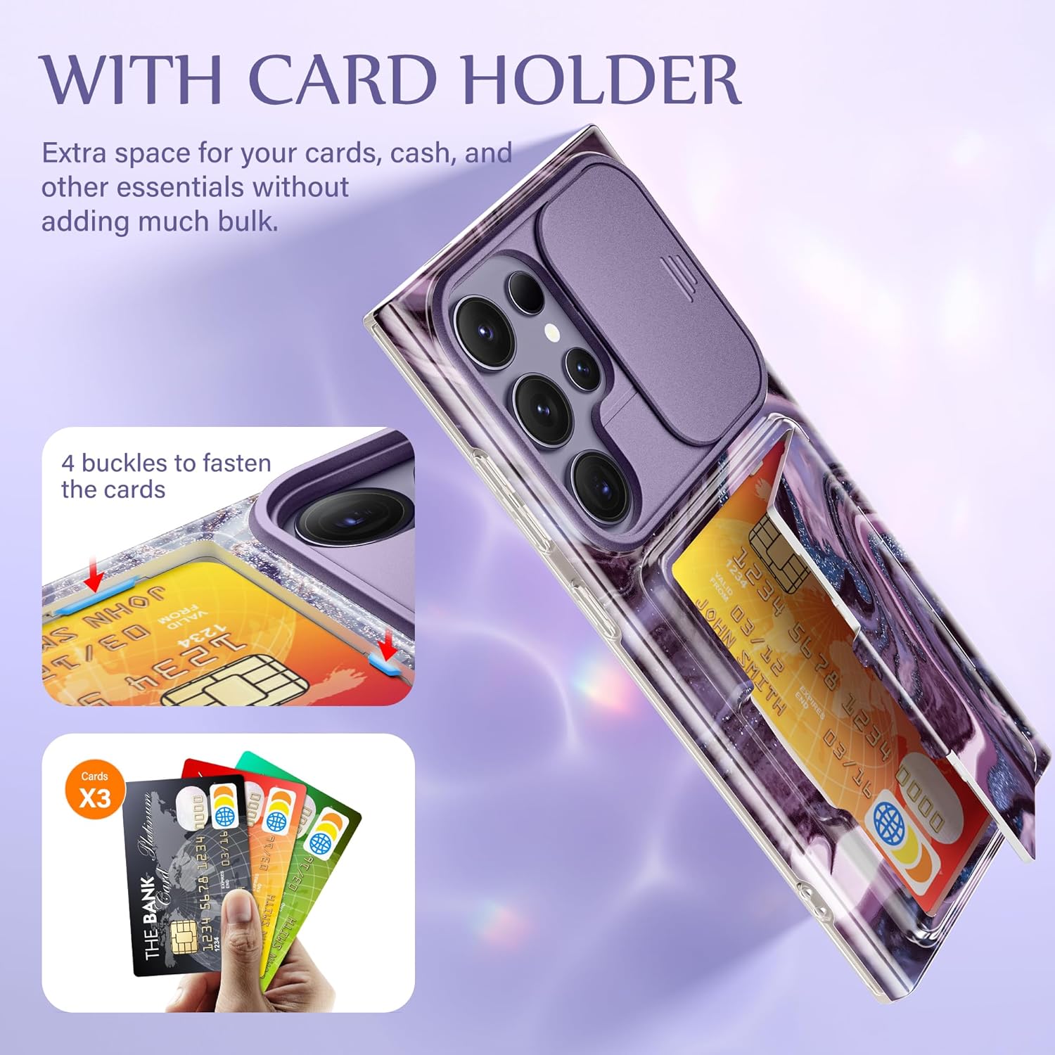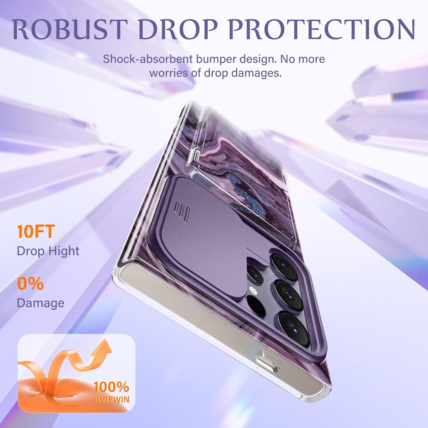 GVIEWIN Designed for Samsung Galaxy S24 Ultra Case with Slide Camera Cover, [Card Holder(3 Cards)] [Screen Protector] Marble Shockproof Protective Kickstand Phone Case 5G 6.8″ (Quicksand/Purple)