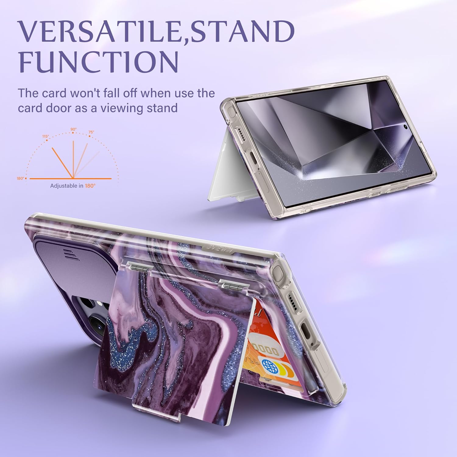 GVIEWIN Designed for Samsung Galaxy S24 Ultra Case with Slide Camera Cover, [Card Holder(3 Cards)] [Screen Protector] Marble Shockproof Protective Kickstand Phone Case 5G 6.8″ (Quicksand/Purple)