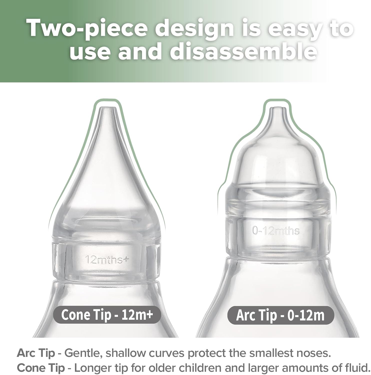 ✔️ GENTLE&COMFORTABLE WITH TWO TIPS FOR GROWING NEEDS:Soft silicone tip ensures gentle, non-invasive mucus removal. Includes two sizes: arc tip for 0-12 months and cone tip for 12 months+.