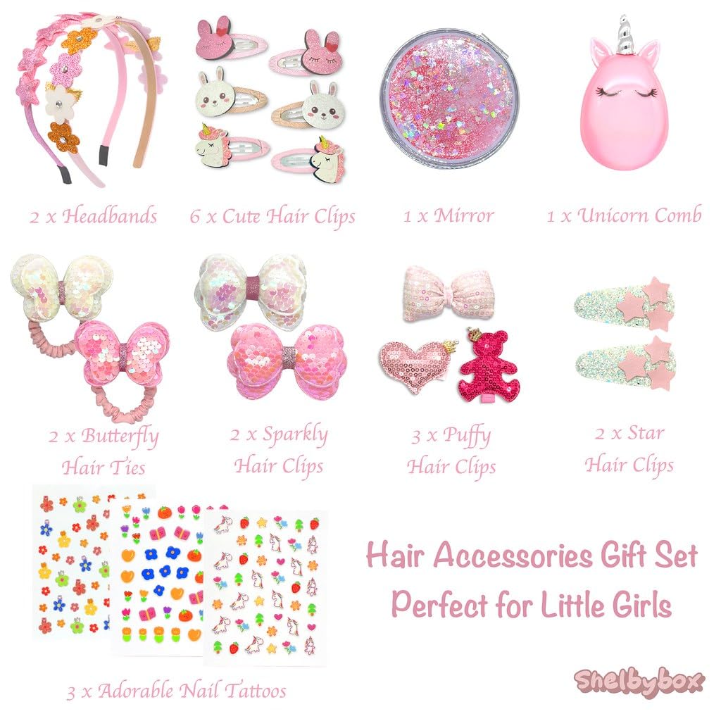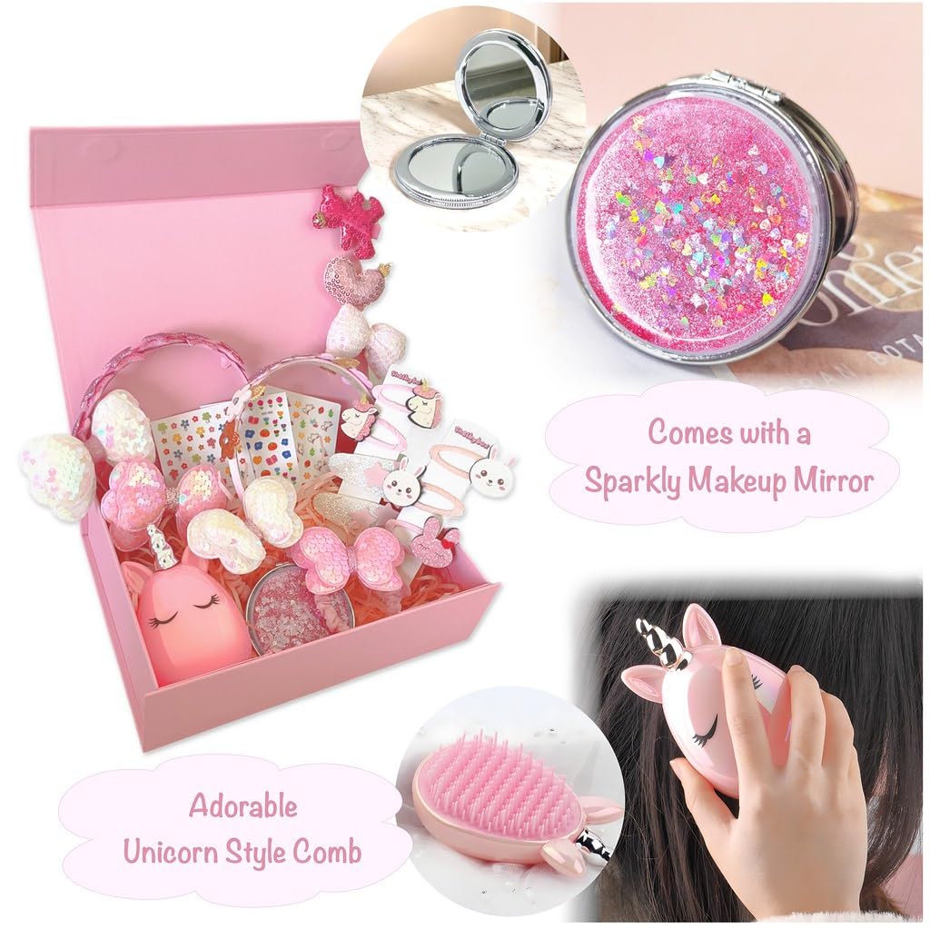 Hair Accessories Set Gift Box for Kids Pink Hair Clips Barrettes Ponytail Ties Bows Headbands with Mirror Unicorn Comb for Daughter Teens Childs Little Girls
