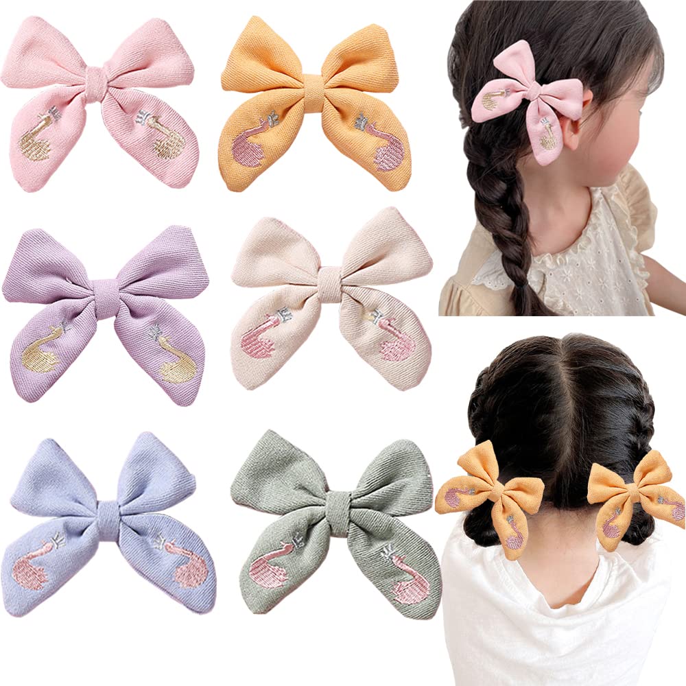Hair Bows Clips,Baby Girl Hair Clips,4 Inch Bows Clips For Girls Flamingo Embroidery Alligator Hair Clips Hair Accessories for Girls Toddler Kids,6 PCS