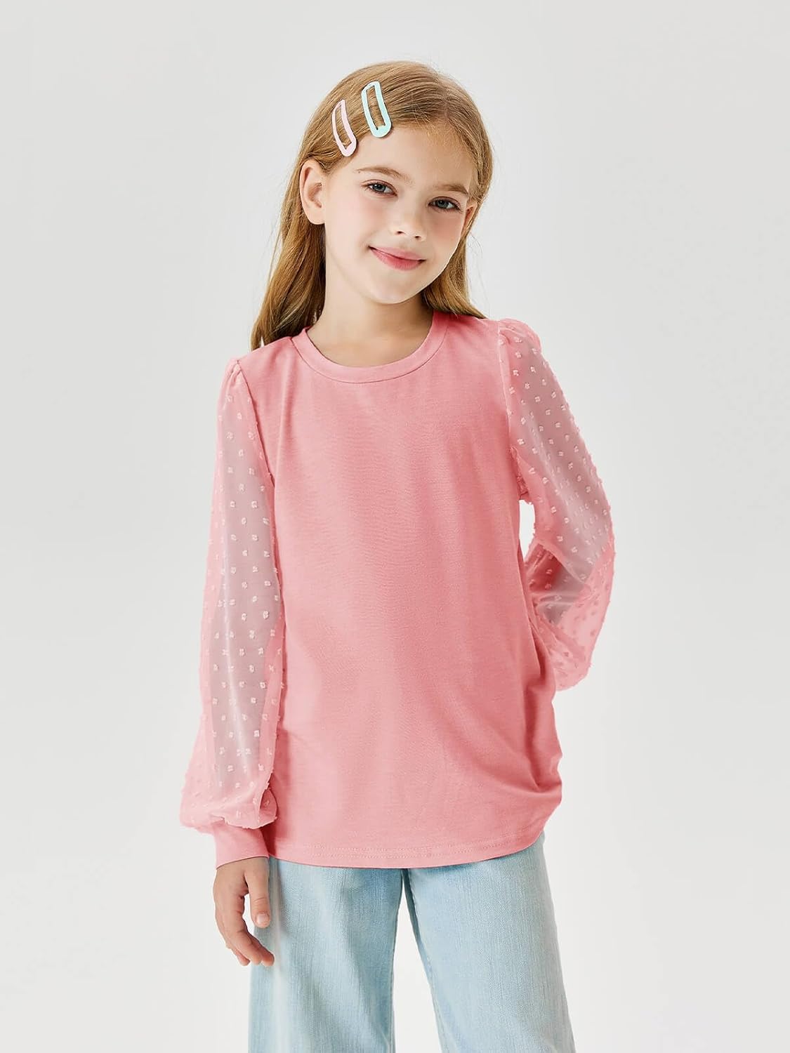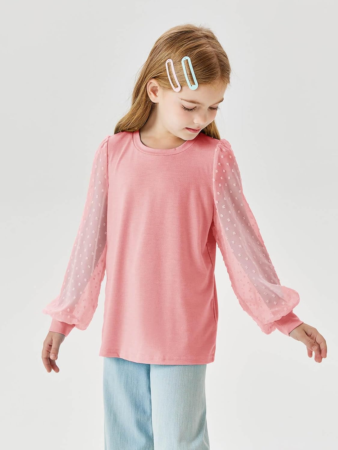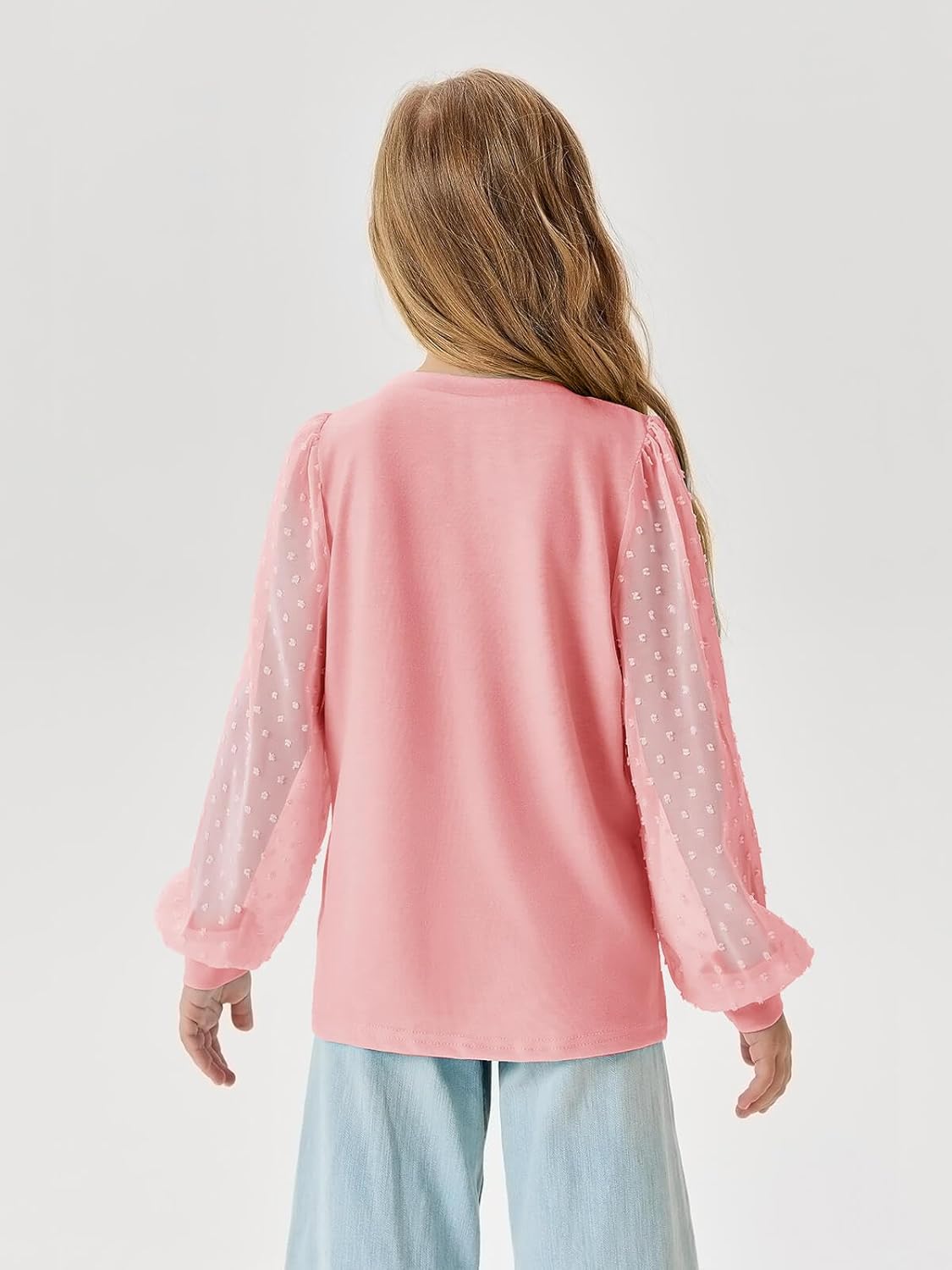 Haloumoning Girls Crewneck Shirts Puff Long Sleeve Polka Dot Chiffon Blouse Fashion Tops