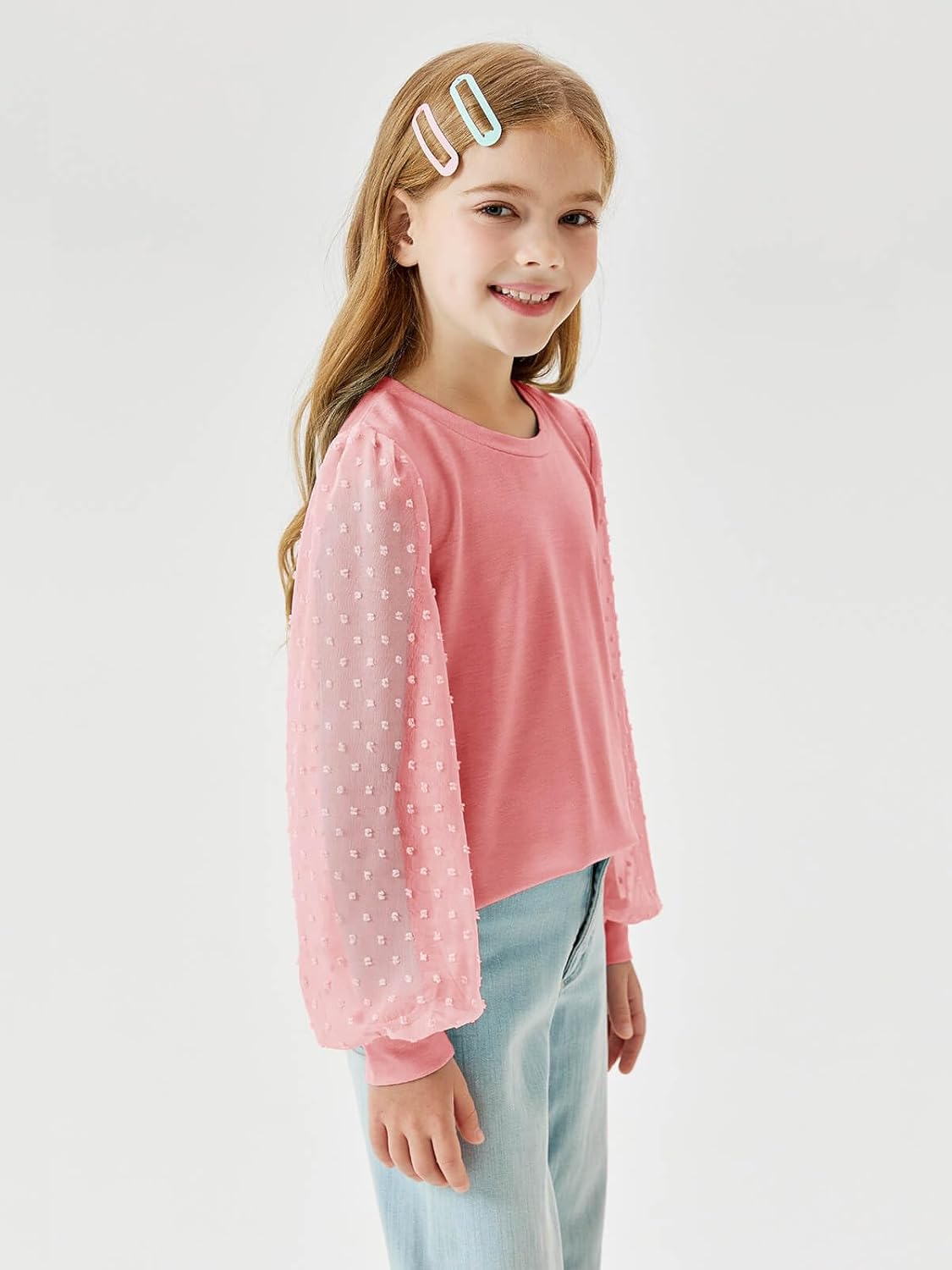 Haloumoning Girls Crewneck Shirts Puff Long Sleeve Polka Dot Chiffon Blouse Fashion Tops