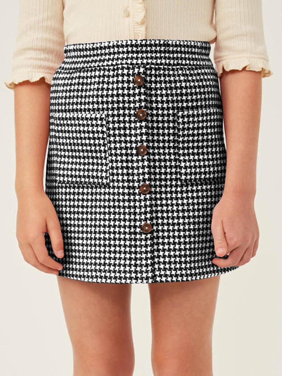 Kids Girls Cute High Waist Skirt Button Houndstooth Mini Skirt with Pockets