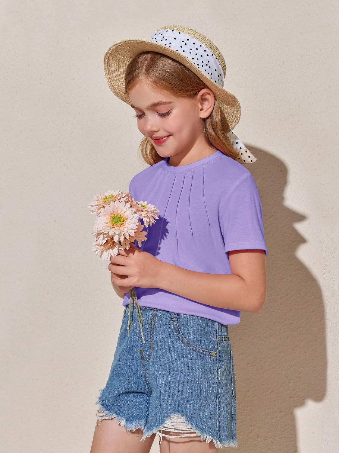 Haloumoning Girls Pleated T Shirts Kids Summer Short Sleeve Fashion Tops Tees 5-14 Years