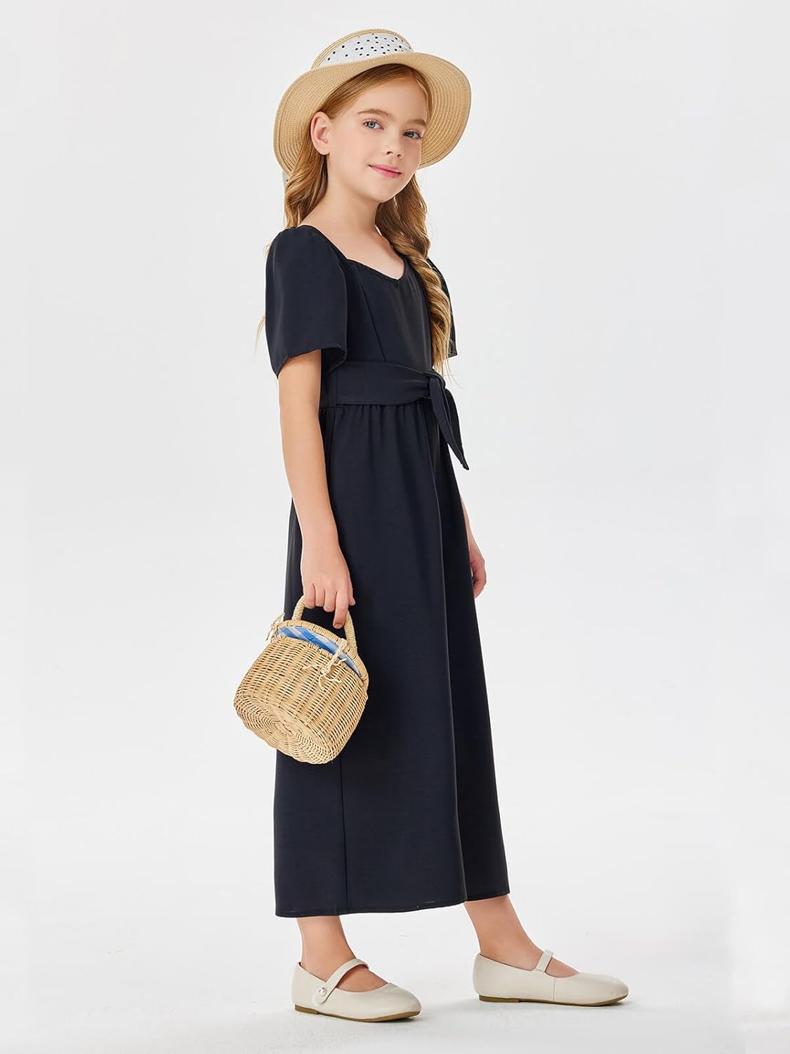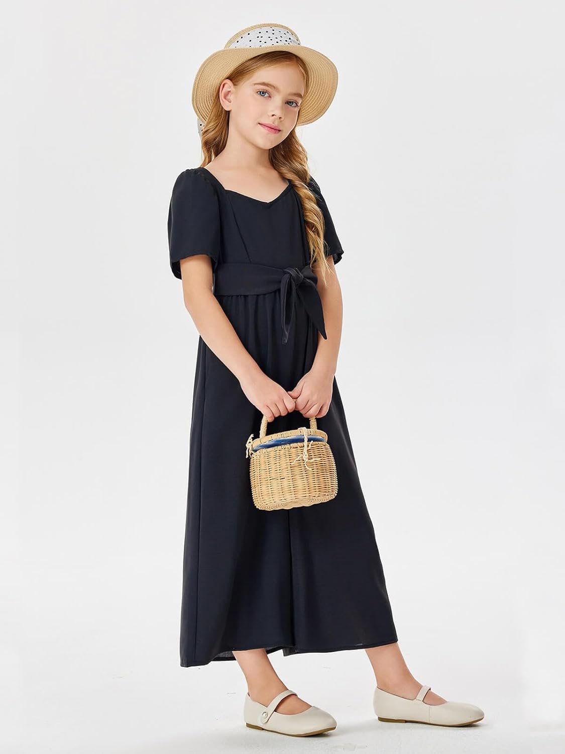 Haloumoning Girls Romper Kids Fashion Square Neck Short Sleeve Wide Leg Pants Jumpsuit with Pockets 7-14 Years