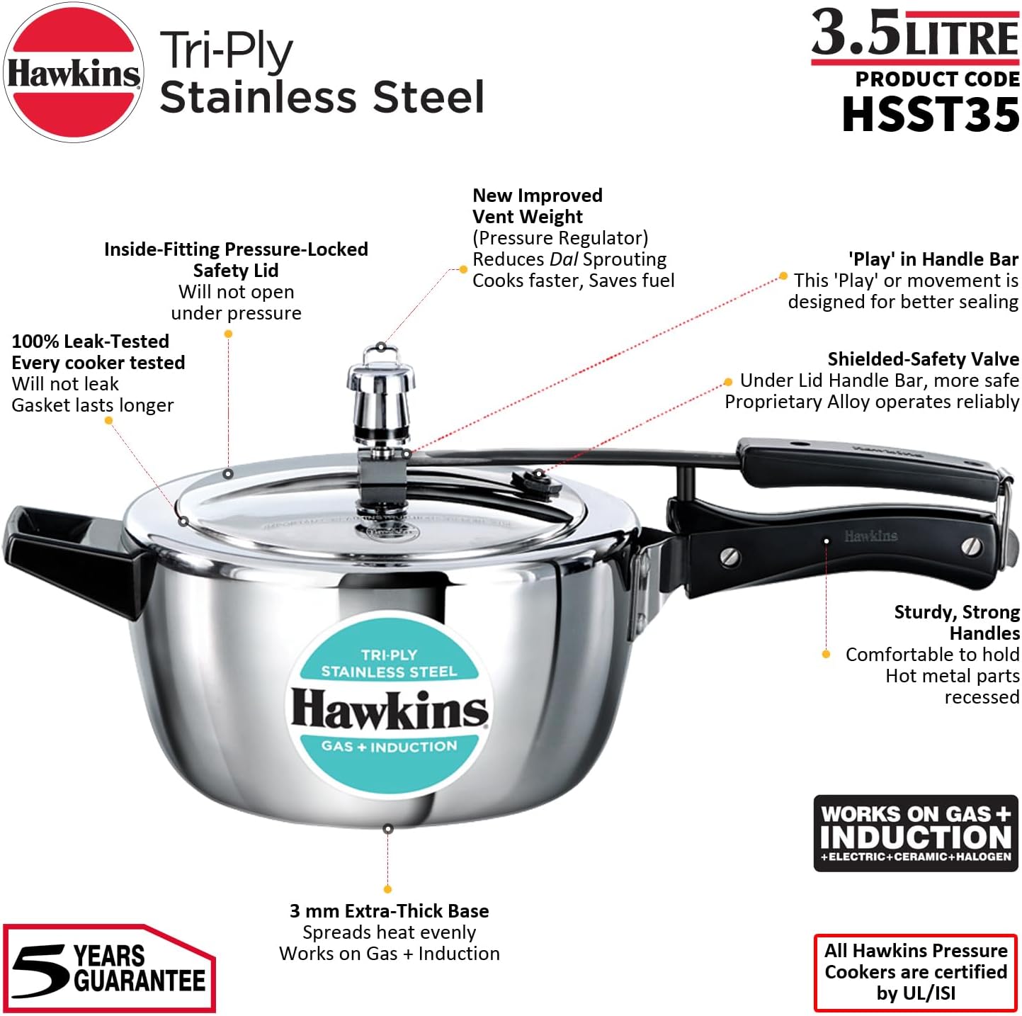Hawkins 3.5 Litre Triply Stainless Steel Pressure Cooker, Inner Lid Cooker, Silver (HSST35)