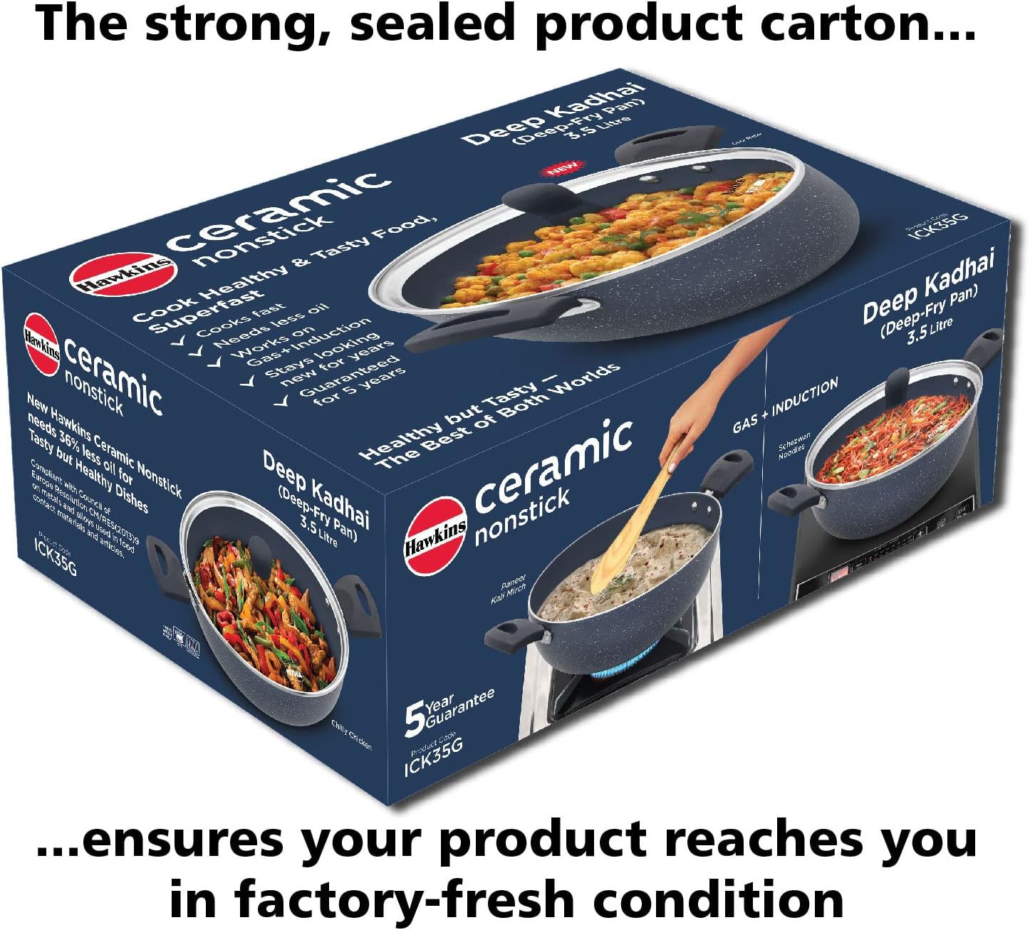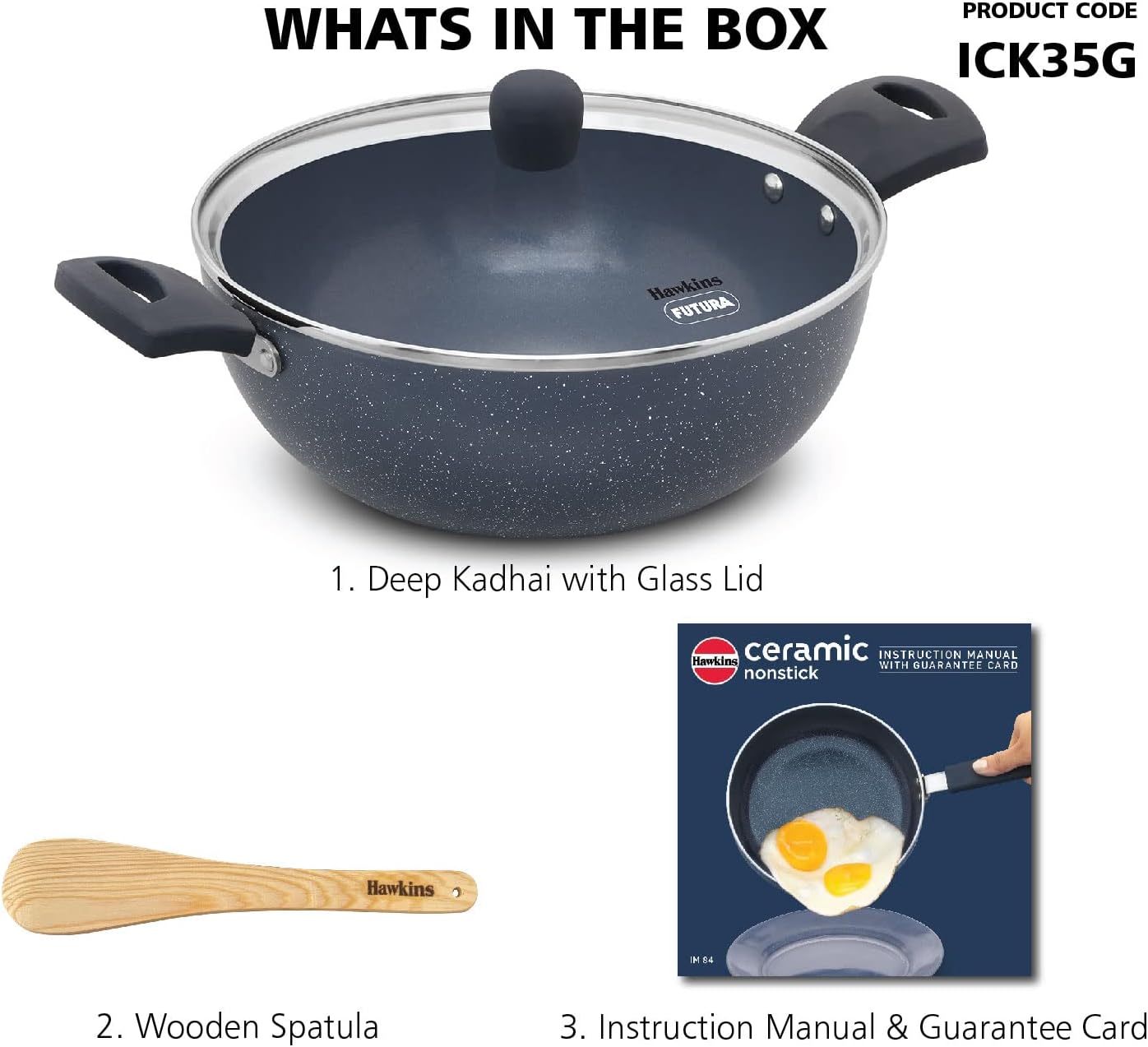 HAWKINS Ceramic Nonstick 3.5 Litre Deep Kadhai, Induction Deep Fry Pan with Glass Lid, Granite Kadai (ICK35G)