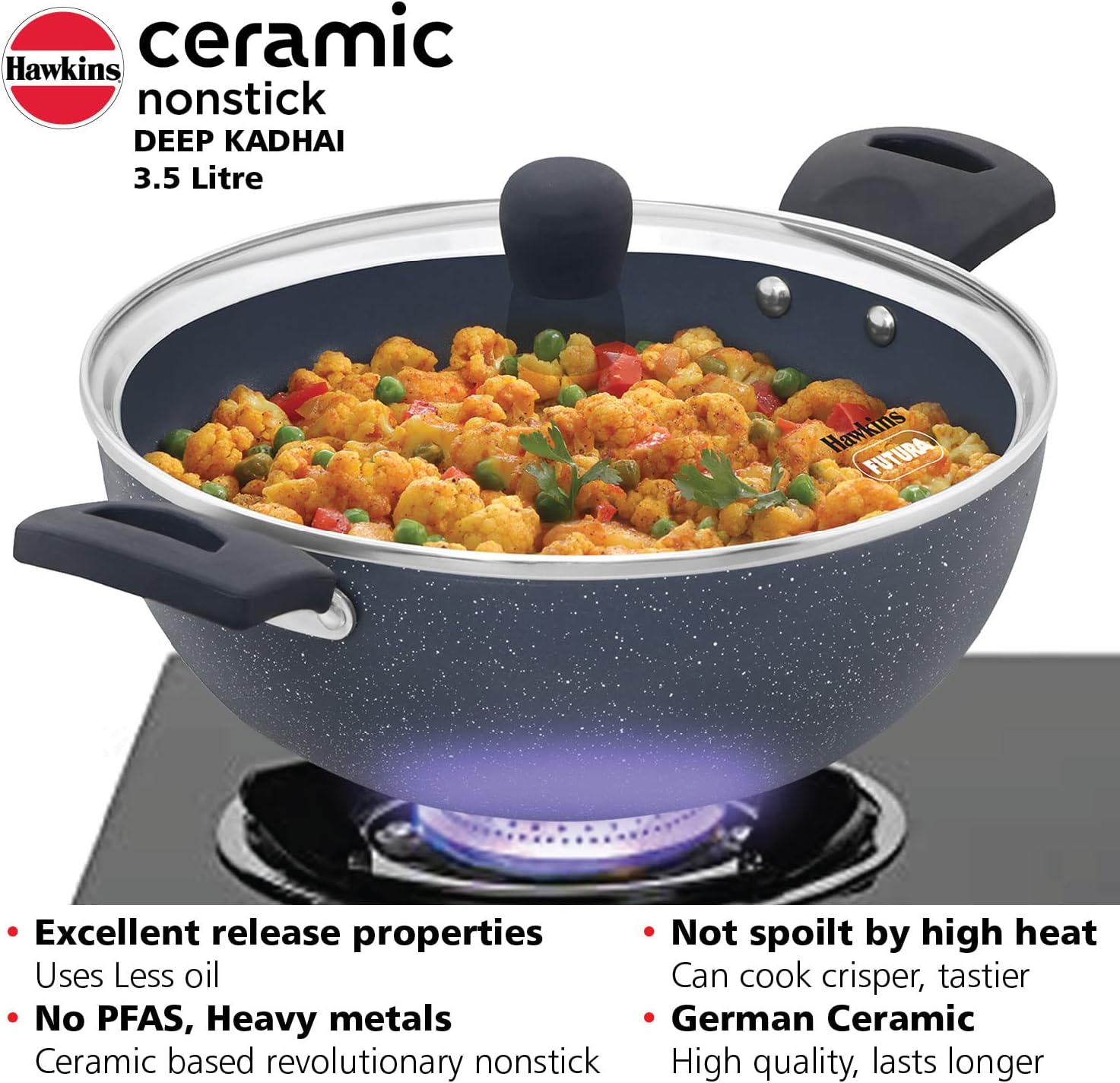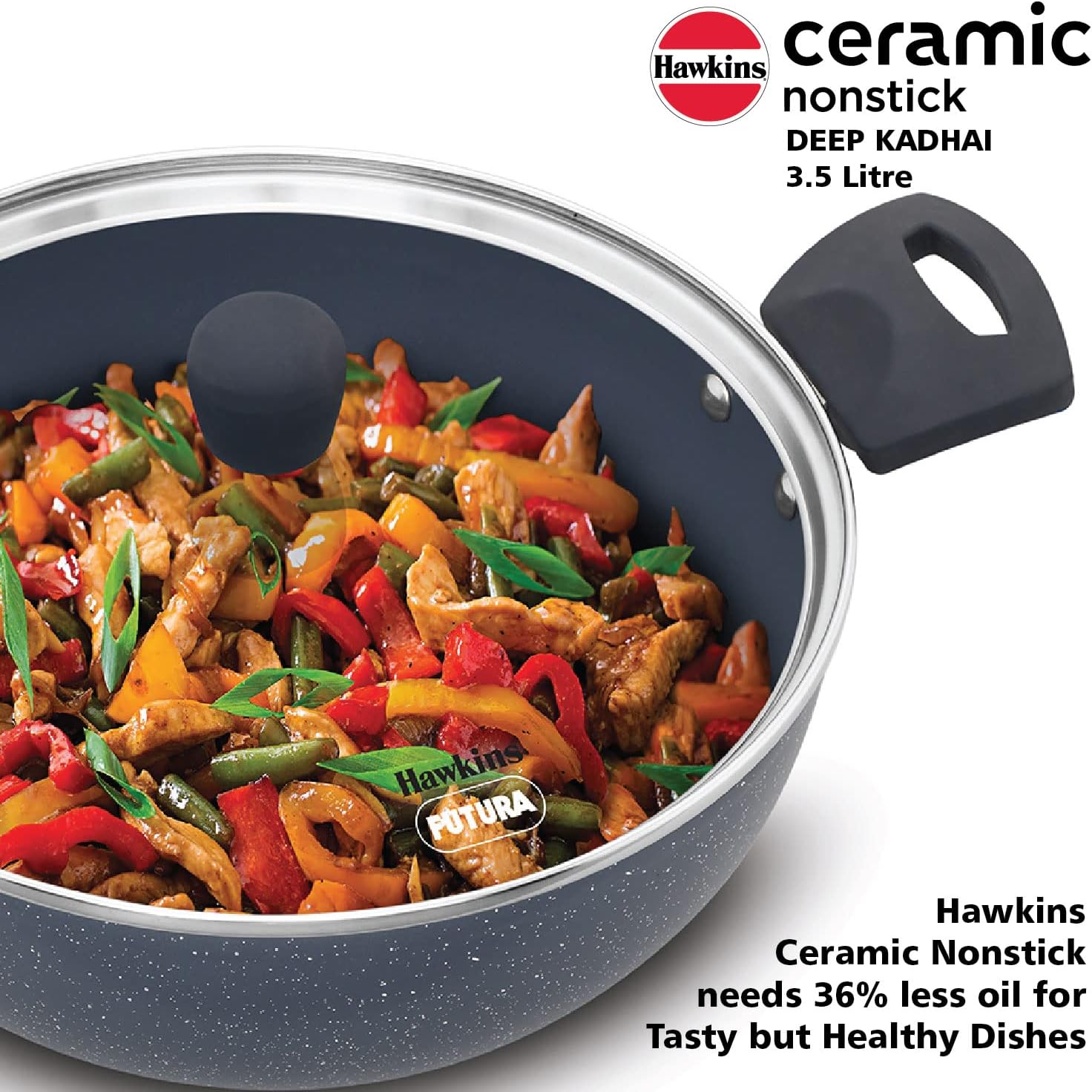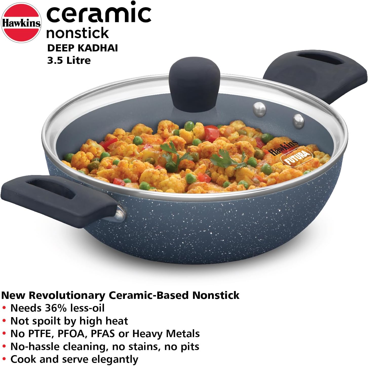 Cooks healthy & tasty food, superfast New Hawkins Ceramic Nonstick Inside – Excellent release properties, uses less oil Not spoilt by high heat – Can cook crisper, tastier German Ceramic – High quality, lasts longer No PFAS, Heavy Metals – Ceramic based revolutionary nonstick