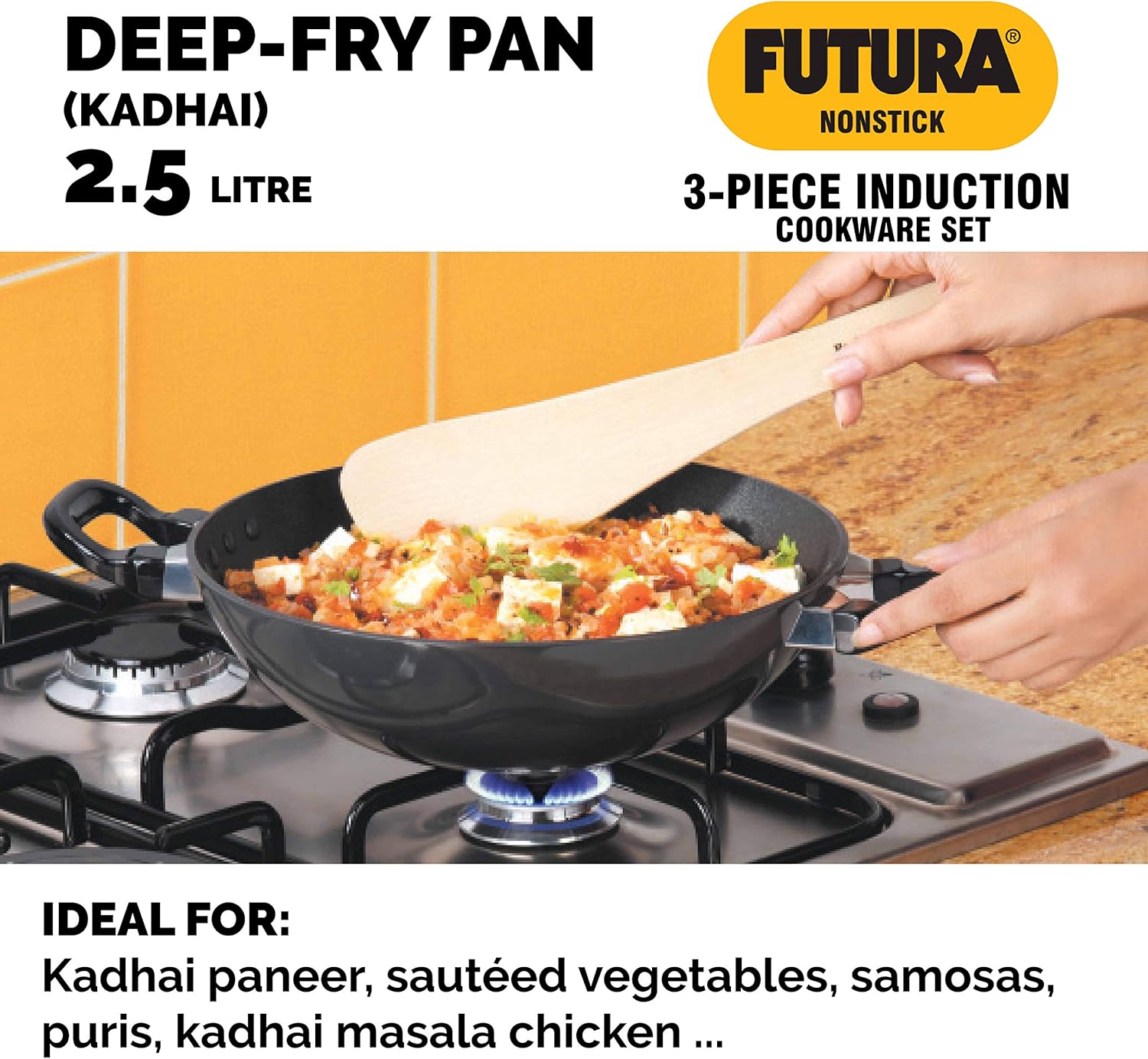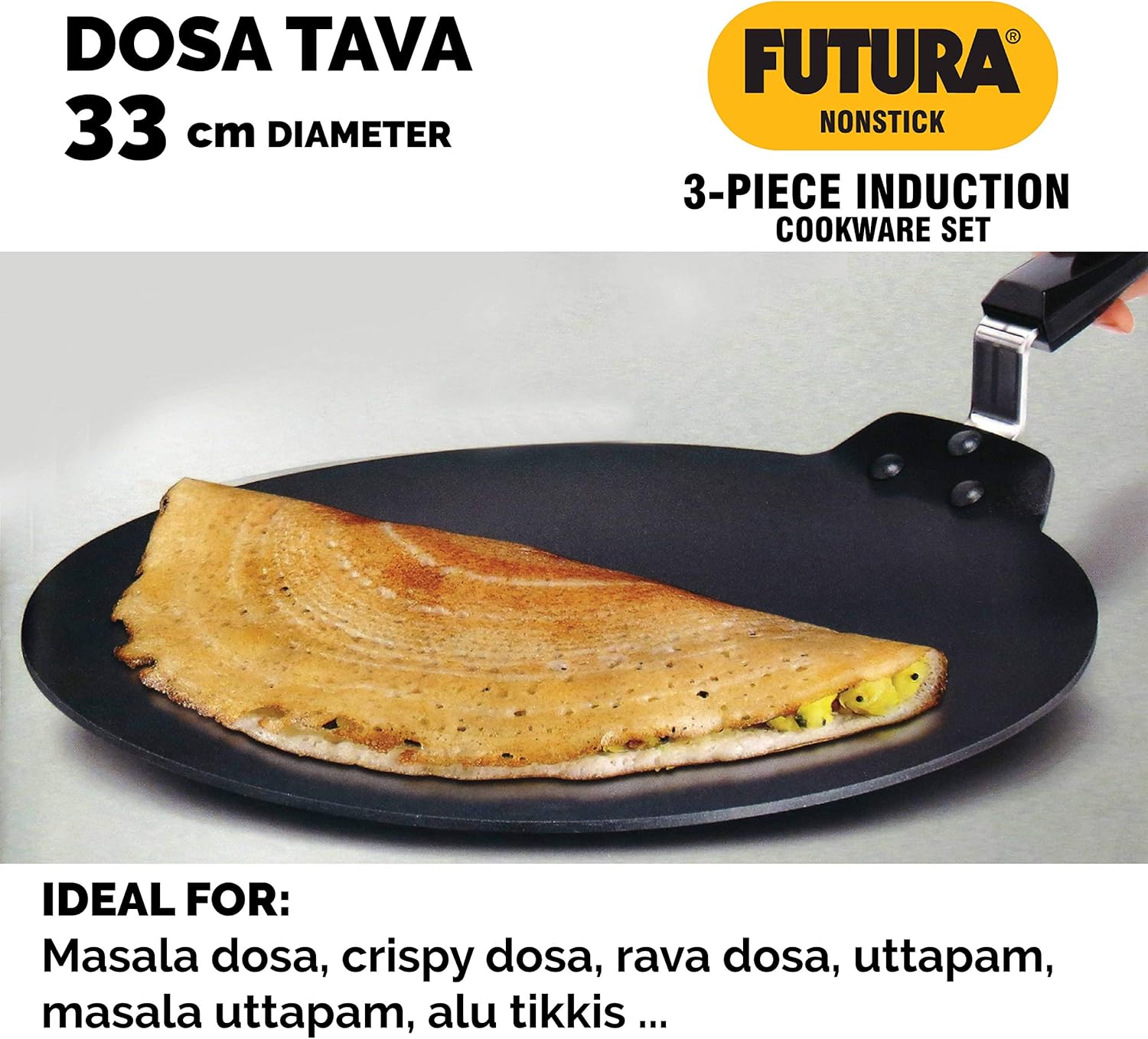 A Versatile Cookware Set that Enables Low Oil Cooking If you wish to prepare food items with very little oil without compromising on their taste, then opt for the Hawkins Futura non stick cookware set. This non-stick cookware set includes a dosa tawa (33cm), a frying pan (18cm), a deep fry pan (2.5L) and two stainless steel lids. The cooking utensils included in this set have a dense non-stick encrusting that prevents food from sticking to the surface. You can conveniently use metallic ladles and wooden spatulas for turning over and picking up food items. The compact form factor of the Hawkins Futura cookware set means it requires minimal storage space. Adds Value to Your Kitchen The non-stick surface of the Hawkins 5 piece cookware set is non-hazardous, highly resistant to stains and does not react with food items. As the result, the effectiveness of these features helps you to cook food that not only taste great but is healthy as well. Moreover, this Hawkins cookware set has a robust anodised surface atop which a superior quality non-stick coat is applied. This bestows the set with a toughness and resilience that enables you to use it for a long time. Additionally, the thermal efficiency of the anodised surface facilitates quick and even heat distribution resulting in consistent cooking. Brand: Hawkins Package Contents: One non-stick deep fry pan (2.5L), one non-stick frying pan (diameter 18cm), one non-stick dosa tawa (diameter 33cm), and two stainless steel lids Materials: Hard anodised aluminium, stainless steel and bakelite (handles) Colour: Black Thickness: 4.88mm (dosa tawa), 3.25mm (deep fry pan) and 3.25mm (frying pan) Corrosion resistant Evenly transmits heat