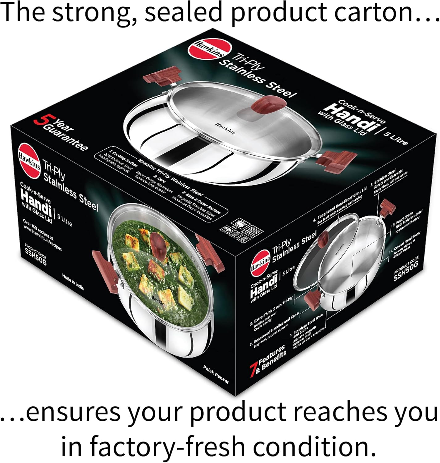 Hawkins Tri-Ply Stainless Steel Induction with friendly Cook-n-Serve Handi with Glass lid, Capacity 5 Liters, Diameter 10.7 Inch, thickness 3 mm, silver (SSH50G)
