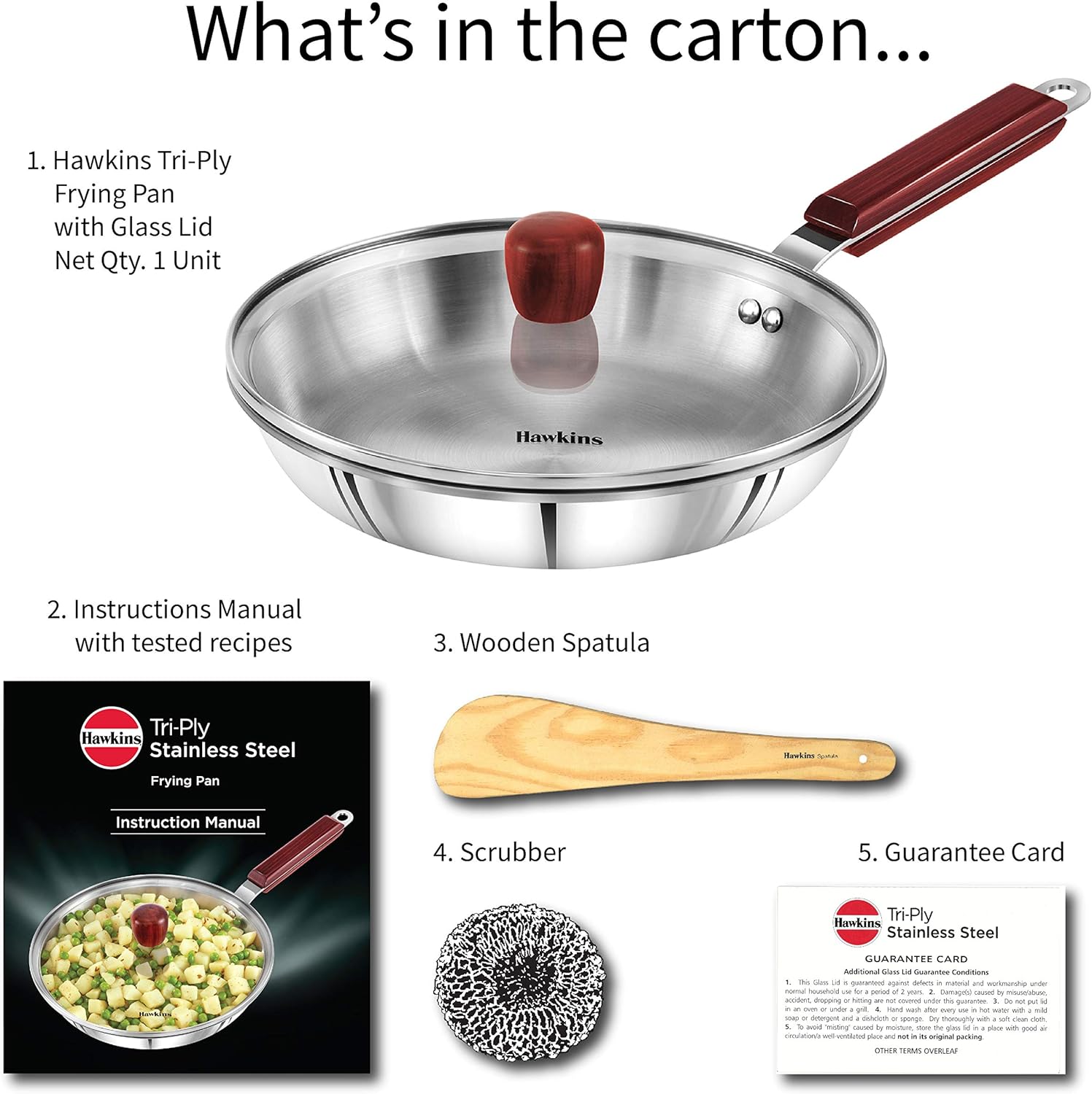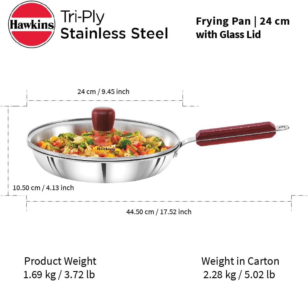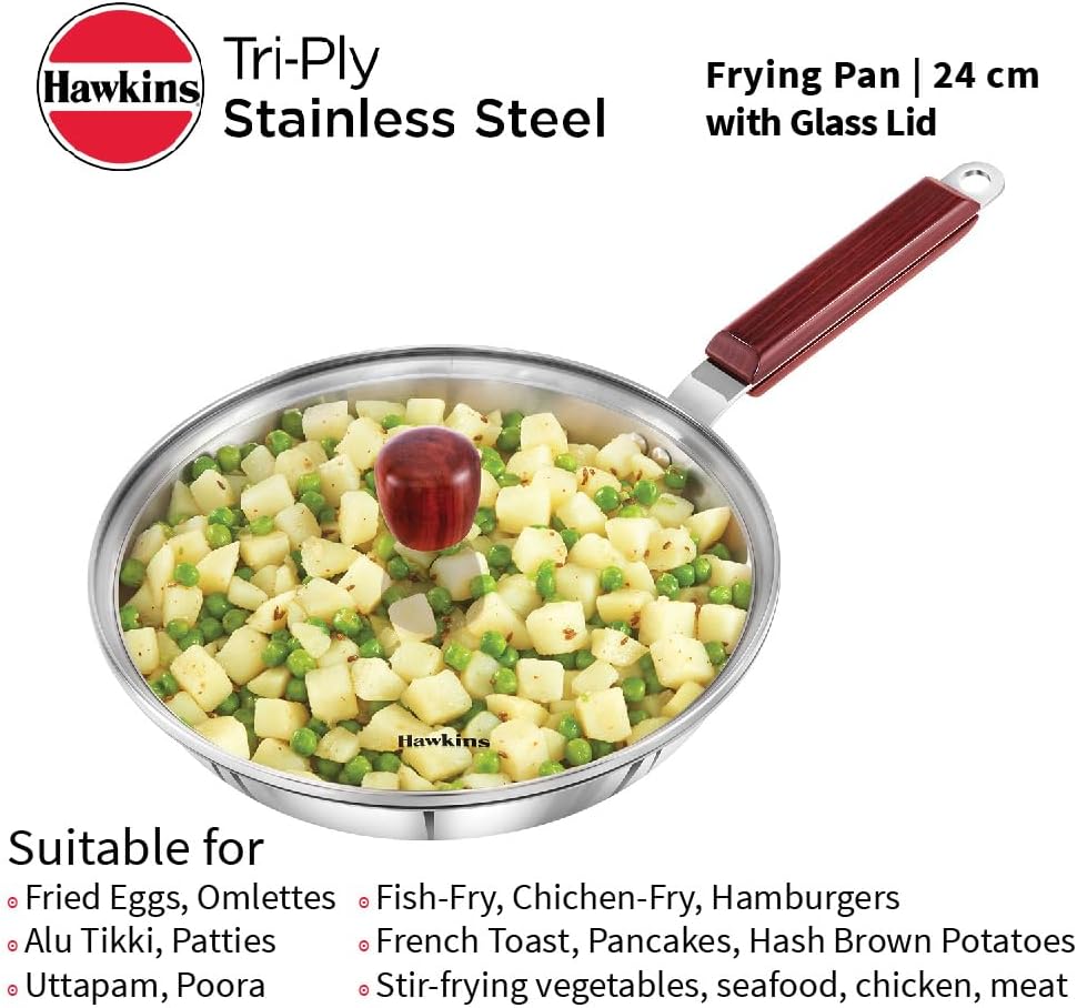 Size:26 cm (With Lid) Hawkins Fry Pan 26cm with Glass Lid, 3 mm Extra-Thick TRI-PLY. 1. Cooking Surface – AISI 304, 18/8 Stainless Steel. Healthy & Low Oil Cooking. 2. Core – Heavy Gauge Aluminium spreads heat evenly. 3. Base & Outer Surface – AISI 430 Magnetic Stainless Steel. Works on Gas & Induction.