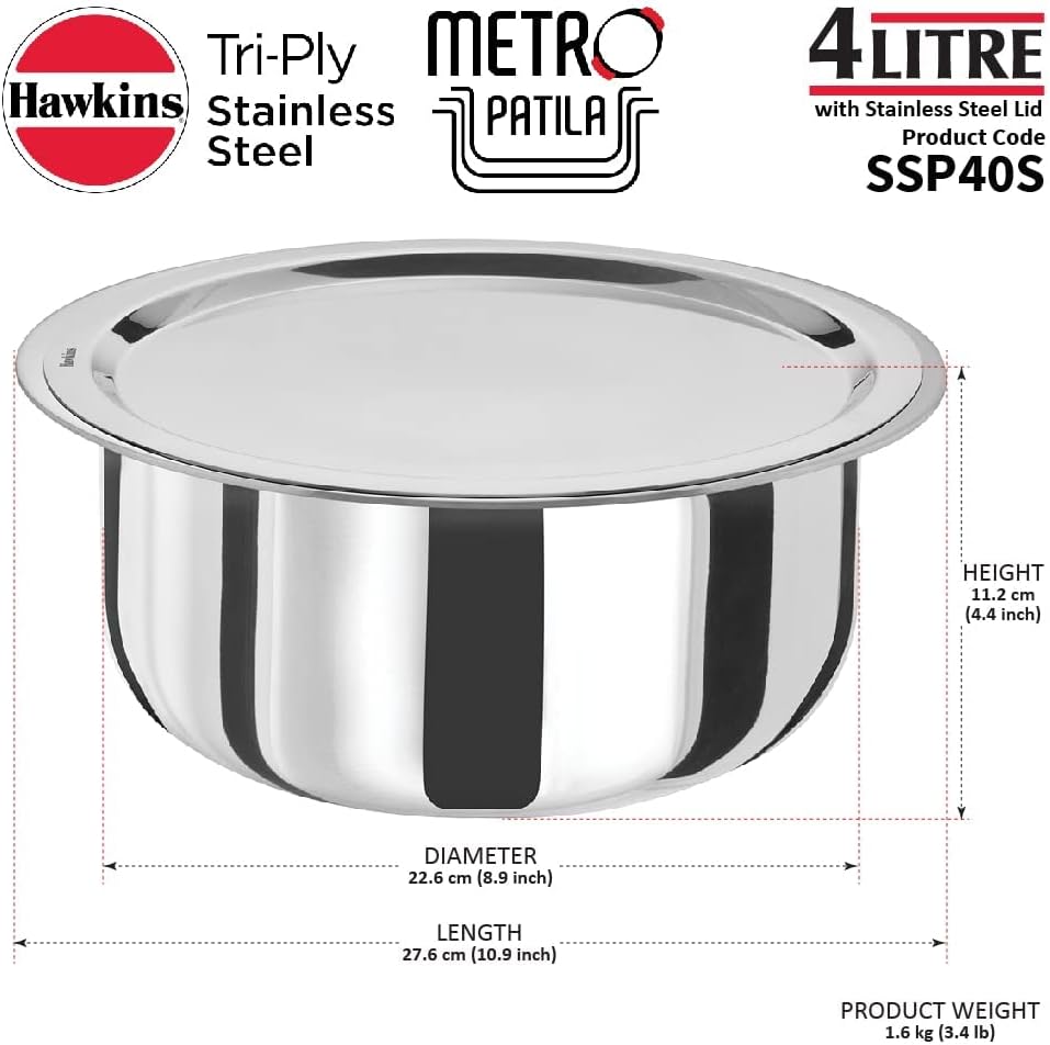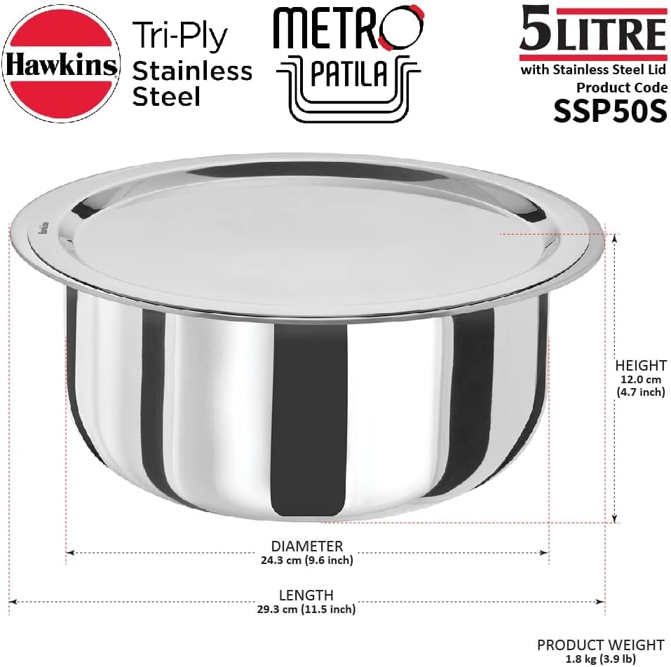 Hawkins Tri-Ply Stainless Steel Patila (or Tope or Tapeli or Bhagona) retains the advantages of cooking on stainless steel surfaces while eliminating the disadvantages of sticking and burning that come with normal stainless steel. Hawkins Tri-Ply Stainless Steel Cookware is made of three layers. The Cooking Surface is made of AISI 304, 18/8 food grade stainless steel that is extremely hygienic, durable and non-reactive to most foods. It does not pit or corrode. The Core is made of heavy gauge aluminium which spreads heat evenly and prevents hot spots. The Base and Outer Surface is made of AISI 430 grade magnetic steel, works well on gas, ceramic, halogen, electric and induction cooktops. It features 2.5 mm Thick Hawkins Tri-Ply Stainless Steel – Food-grade, hygienic, spreads heat evenly. It has unique 2-in-1 Elliptical Rim – the Broad side is to safely grip, pour & carry hot food and the Narrow side is for Ezee-pour and Ezee-grip with tongs. You can cook and serve in the same pot. It is easy to clean also. In it the food stays hot longer. It is stackable and has a space-saver design which allows the different sizes of Metro Patila to fit into each other, thus it frees up space in Modern Kitchens.It is guaranteed for 5 years.