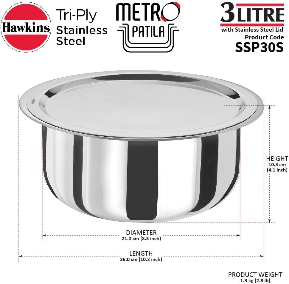 Hawkins Tri-Ply Stainless Steel Patila (or Tope or Tapeli or Bhagona) retains the advantages of cooking on stainless steel surfaces while eliminating the disadvantages of sticking and burning that come with normal stainless steel. Hawkins Tri-Ply Stainless Steel Cookware is made of three layers. The Cooking Surface is made of AISI 304, 18/8 food grade stainless steel that is extremely hygienic, durable and non-reactive to most foods. It does not pit or corrode. The Core is made of heavy gauge aluminium which spreads heat evenly and prevents hot spots. The Base and Outer Surface is made of AISI 430 grade magnetic steel, works well on gas, ceramic, halogen, electric and induction cooktops. It features 2.5 mm Thick Hawkins Tri-Ply Stainless Steel – Food-grade, hygienic, spreads heat evenly. It has unique 2-in-1 Elliptical Rim – the Broad side is to safely grip, pour & carry hot food and the Narrow side is for Ezee-pour and Ezee-grip with tongs. You can cook and serve in the same pot. It is easy to clean also. In it the food stays hot longer. It is stackable and has a space-saver design which allows the different sizes of Metro Patila to fit into each other, thus it frees up space in Modern Kitchens.It is guaranteed for 5 years.