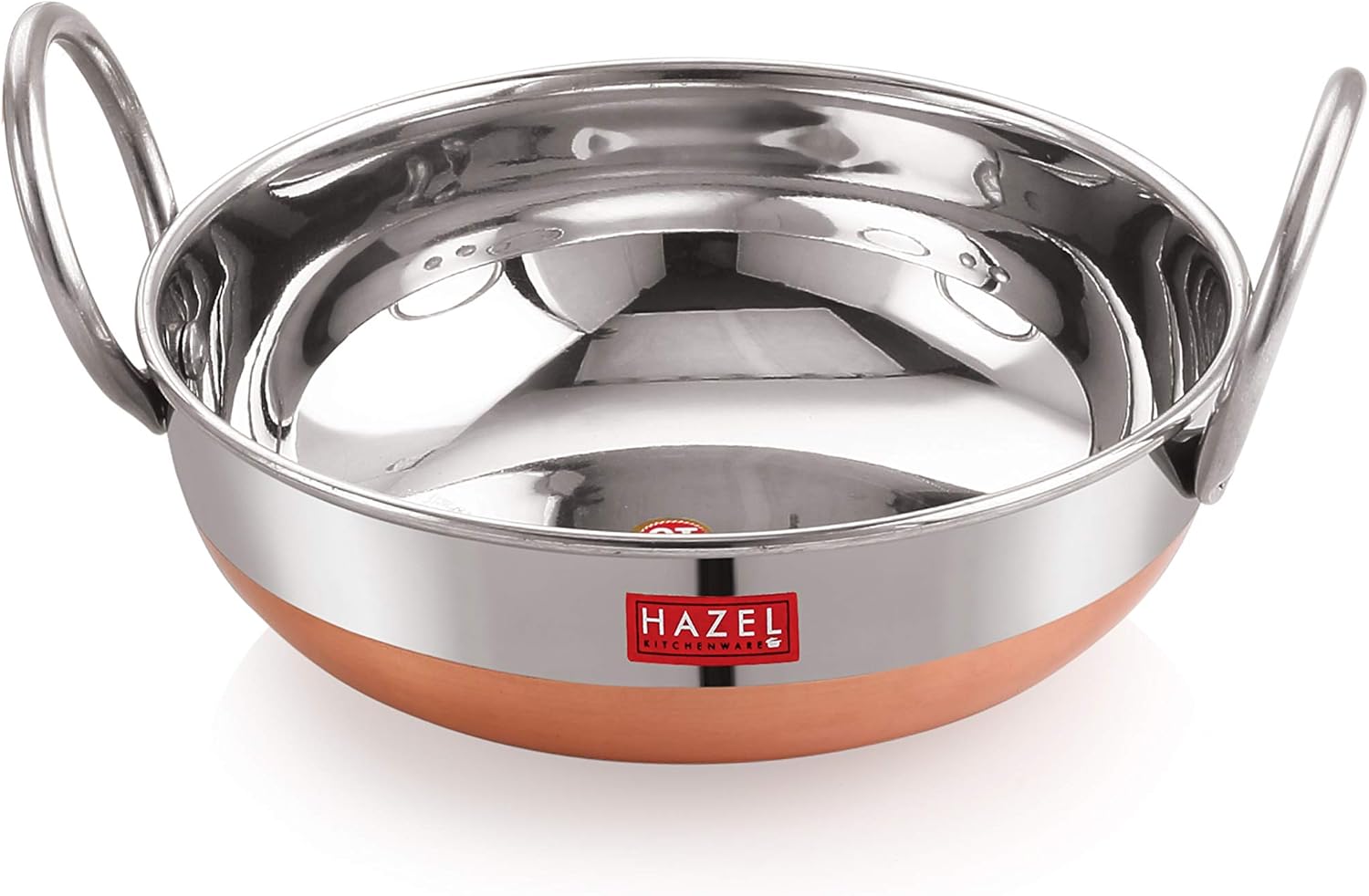 HAZEL Alfa 18 Gauge Premium Stainless Steel Kadai with Copper Bottom and Lid, 1500 ml, Silver & Copper