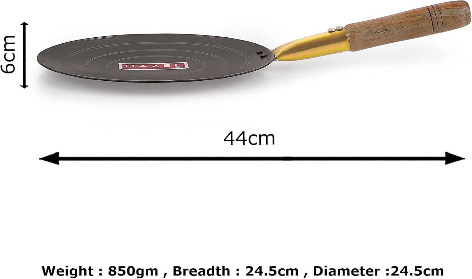HAZEL Iron Tawa With Wooden Handle Grip Lokhand Loha Pan Concave Tava for Chapathi Roti Paratha Fulka Dosa Omelette, 24.5 cm