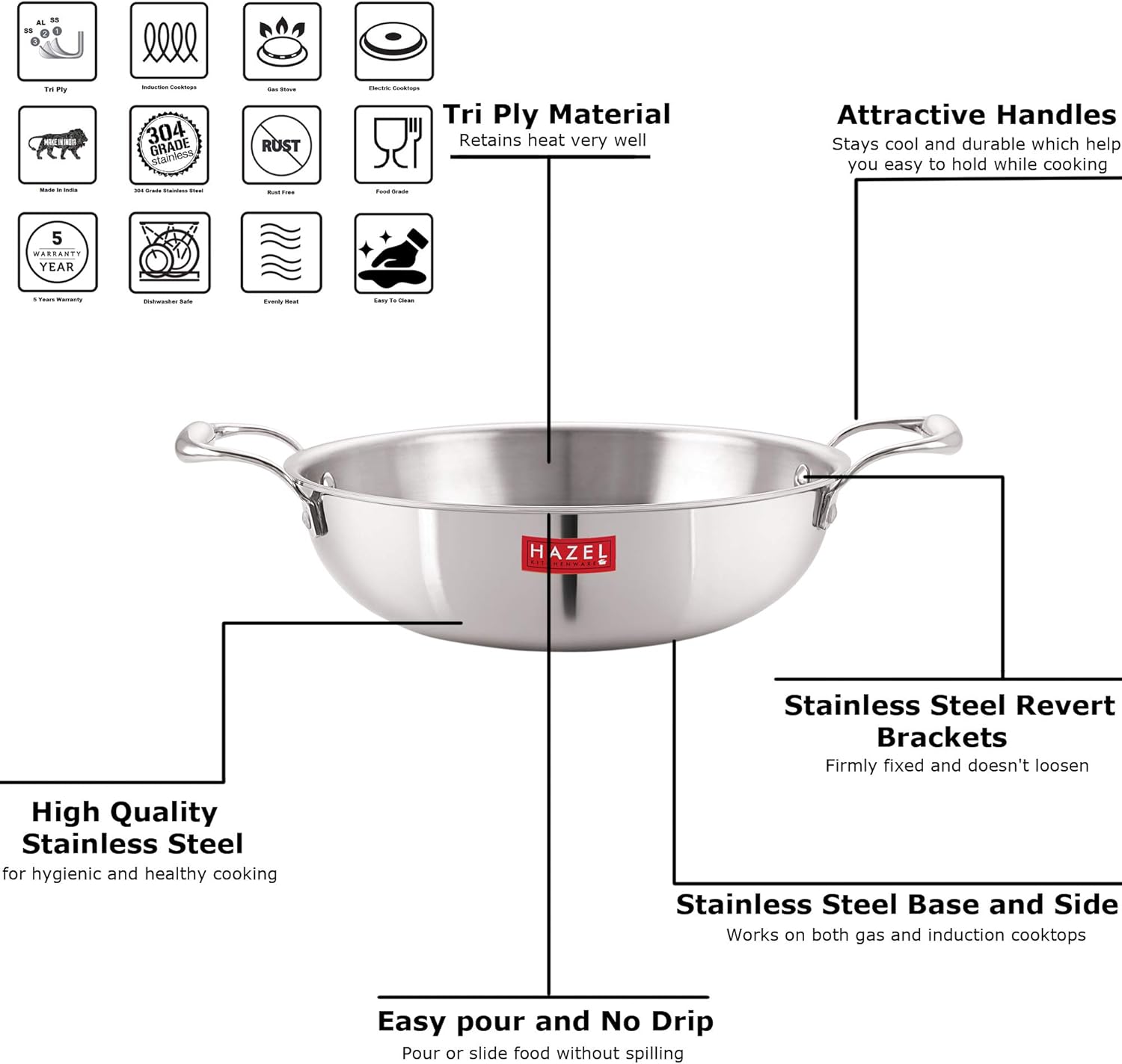 HAZEL Triply Stainless Steel Induction Bottom Kadhai, 1.2 Litre, 18.5 cm