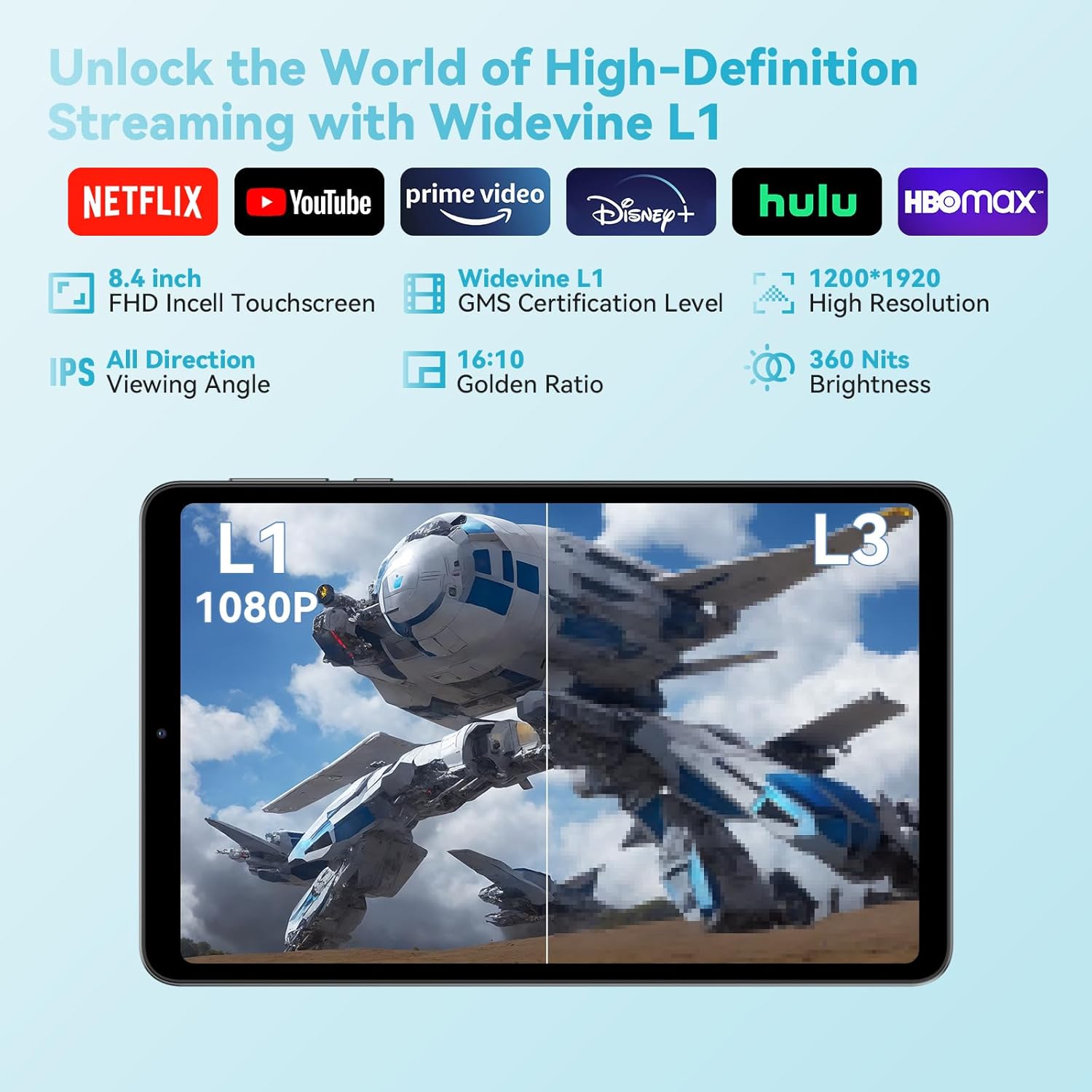 Widevine L1 & 8.4″ FHD Display – Gaming tablet featuring an 8.4″ FHD 1920×1200 screen, movies and games leap off the display with phenomenal clarity and richness. Elevate your streaming experience with Widevine L1 certification. Enjoy platforms like HBO, YouTube, and more with stunning clarity and flawless playback