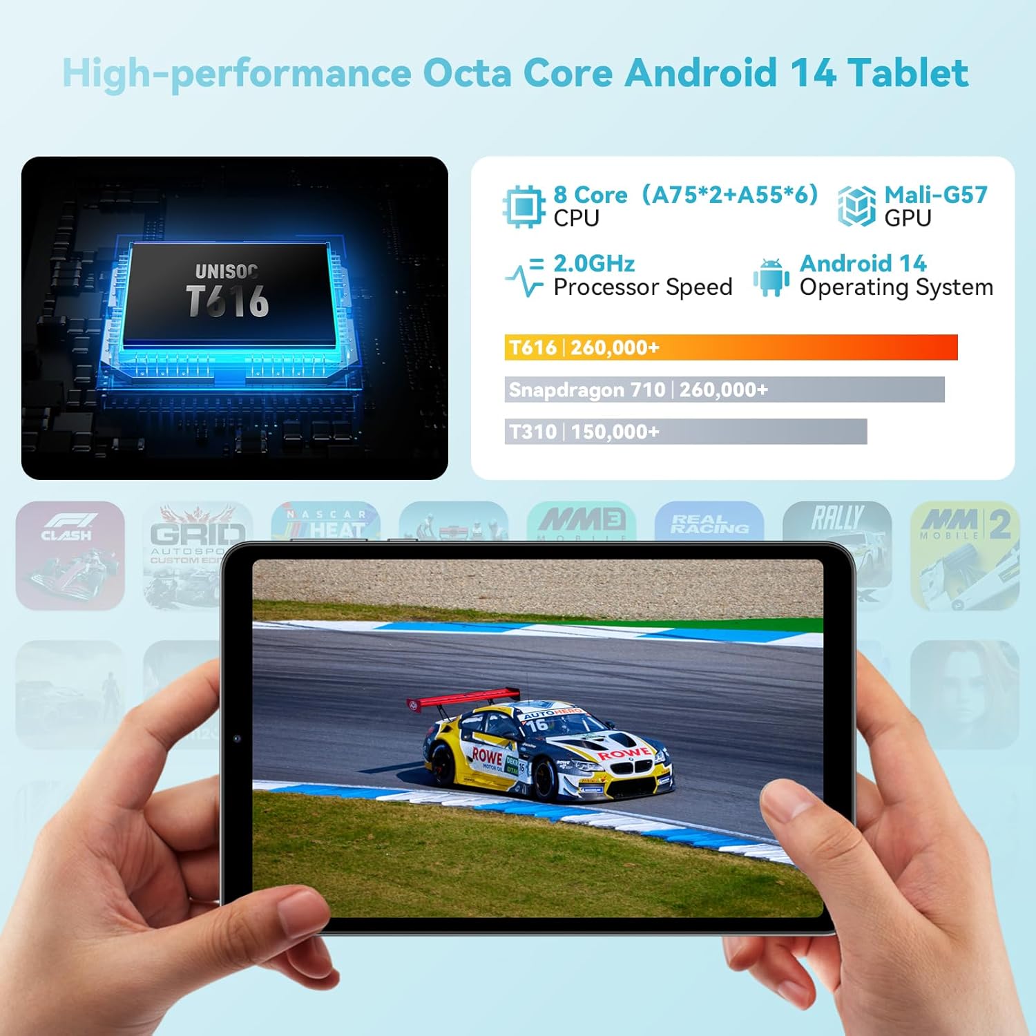 Generous Storage Capacity – Small tablet offers up to 8GB RAM (achieved via 4GB+4GB expansion), 128GB ROM, and expandable storage of up to 2TB via a TF card (not included). It also features Bluetooth 5.2 and 2.4/5GHz WiFi support, providing seamless high-speed wireless connectivity for calls, browsing, and streaming