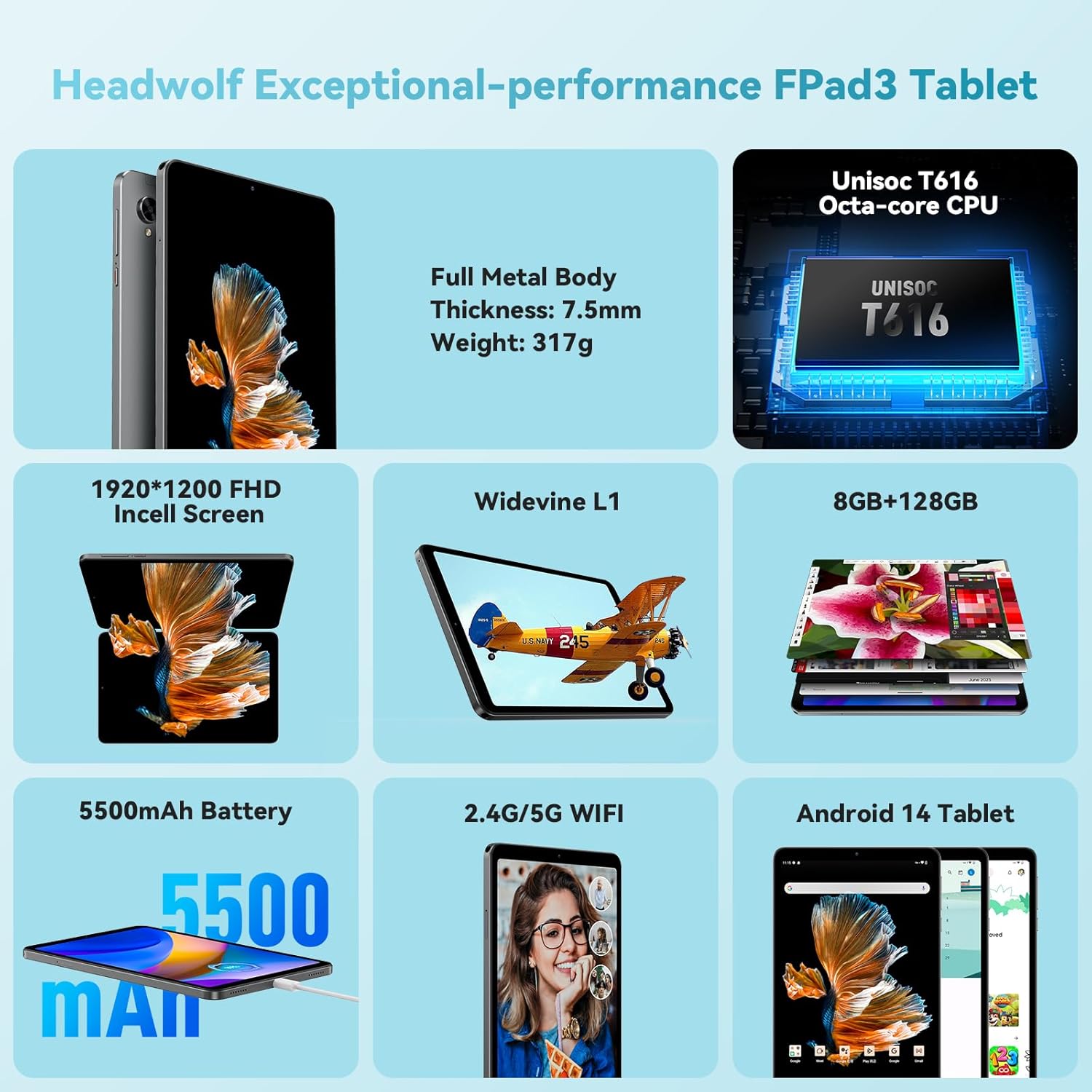 Headwolf Android 14 Tablet, FPad3 8.4 inch FHD 1920 * 1200 Display Android Tablet, 8GB RAM +128GB ROM Octa Core Gaming Tablet, Widevine L1, 5500mAh, 13MP+8MP, WiFi Tablet for Adults
