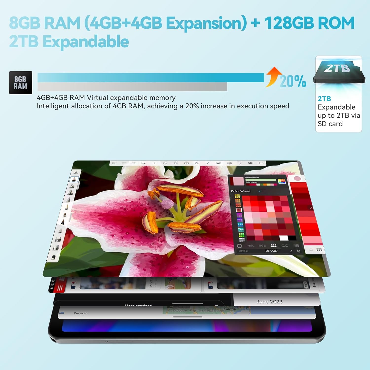 Generous Storage Capacity – Small tablet offers up to 8GB RAM (achieved via 4GB+4GB expansion), 128GB ROM, and expandable storage of up to 2TB via a TF card (not included). It also features Bluetooth 5.2 and 2.4/5GHz WiFi support, providing seamless high-speed wireless connectivity for calls, browsing, and streaming