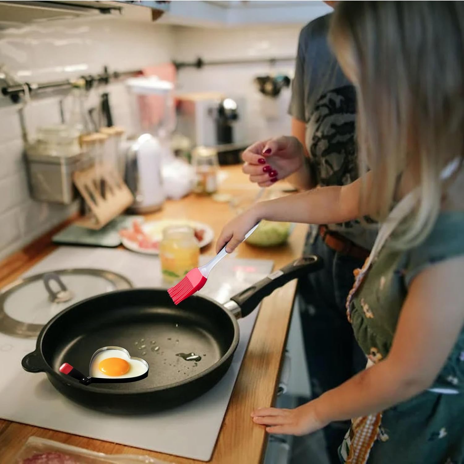 【With Oil Brush and Egg Separator】: The heart shaped pancake molds set wraps two heart shaped pancake/egg rings (size 3.5*3.3*0.6 inches), a silicone oil brush and an egg separator. It can help you better control the amount of oil as well as egg yolks perfectly.