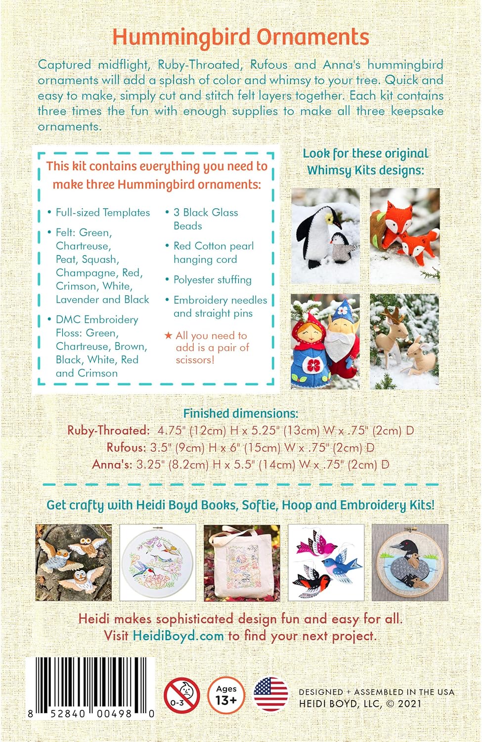 Captured midflight Ruby-Throated, Rufous, and Anna’s hummingbird ornaments will add a splash of color and whimsy to your tree. Quick and easy to make, simply cut and stitch felt layers together. Each Kit contains three times the fun with enough supplies to make all three keepsake ornaments. All components are included.