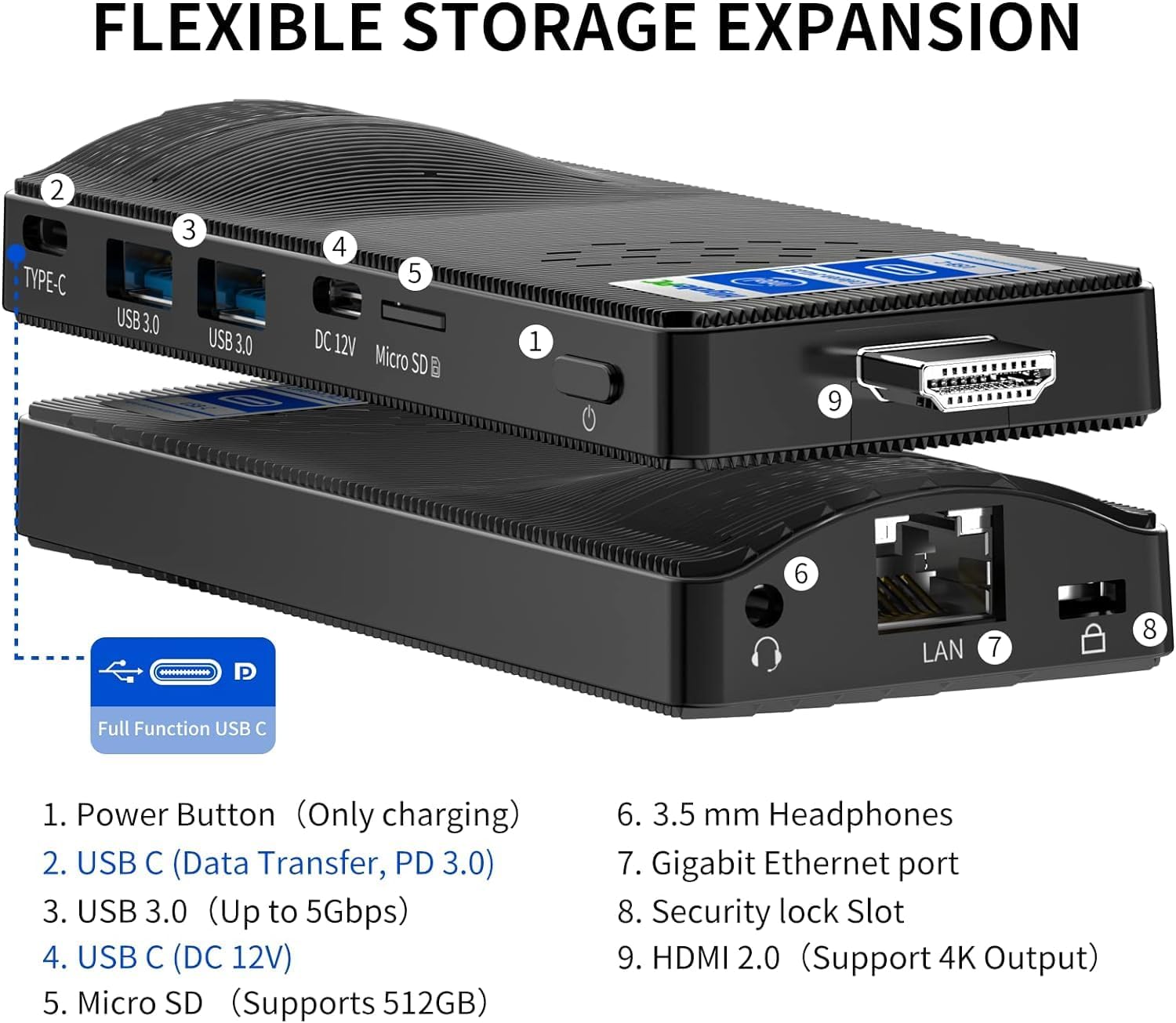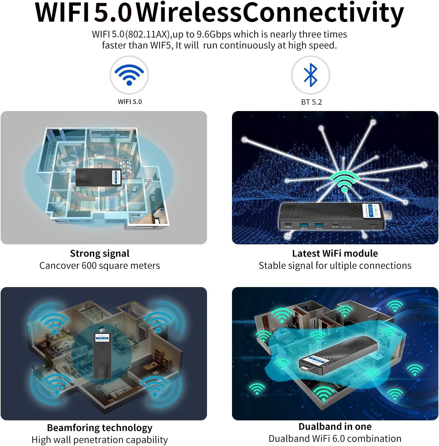 【Rich build in & I/O Ports】Portable Computer Stick all important connections are available,1 x USB-C(Full function),2 x USB 3.0,1 x HDMI 2.0,1 x RJ45,1 x TF card ports,1 x DC PROTS,If Micro PC ports are not enough for our daily computer use,we can connect the expansion port through the full-featured USB C port. The Gigabit Ethernet port provides you with a constant and stable network. The pc stick also supports dual-band wifi 5.0 , so you can connect to a 2.4G or 5G wireless network, and Bluetooth 5.0 also allows you to connect peripherals such as keyboards, mouse etc.
