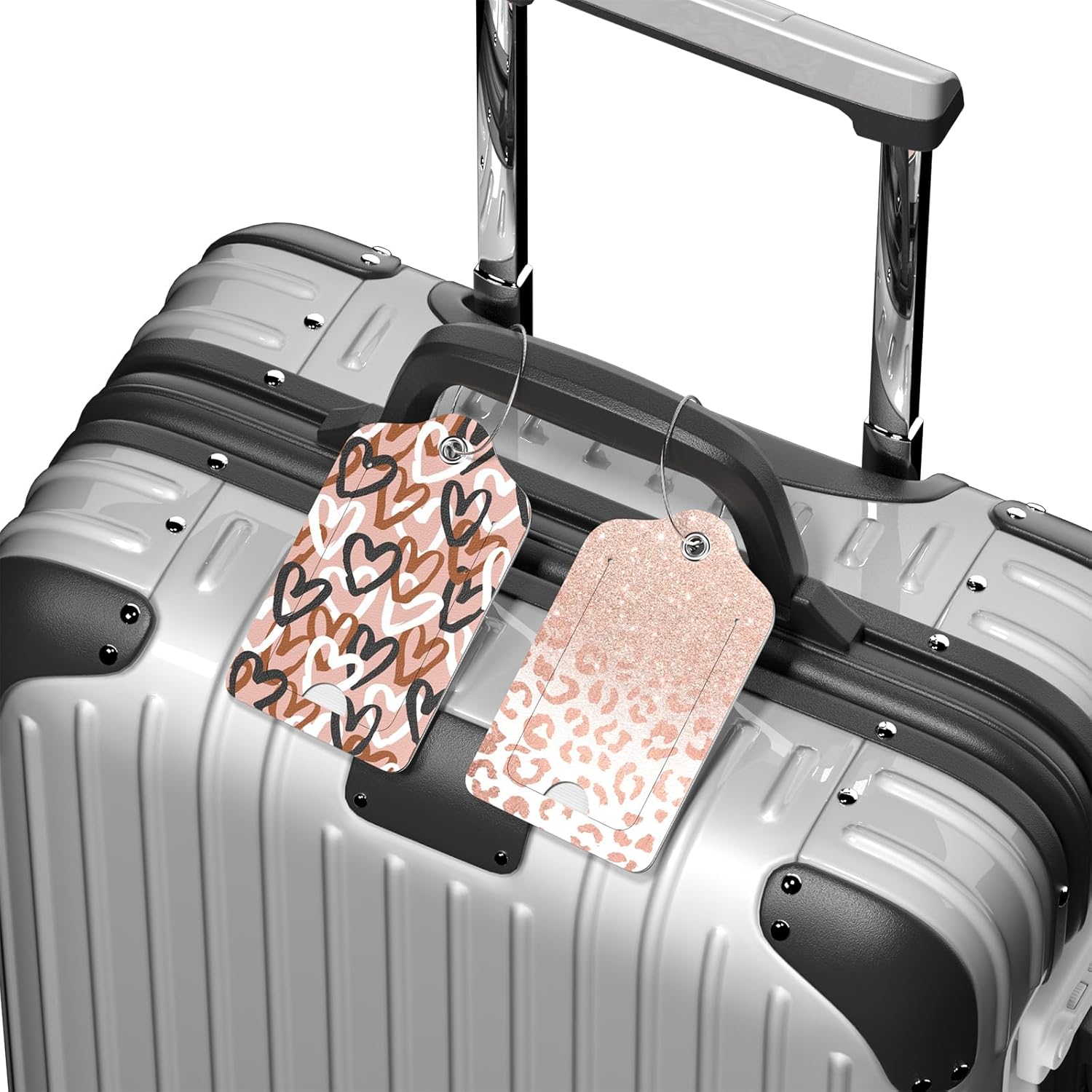 Hsxnam 2 Pack PU Leather Luggage Tags for Suitcase, Travel Cruise Luggage Tag with Privacy Flap, Name ID Label and Metal Loop for Women Men Baggage Handbag School Bag Backpack, Heart Leopard