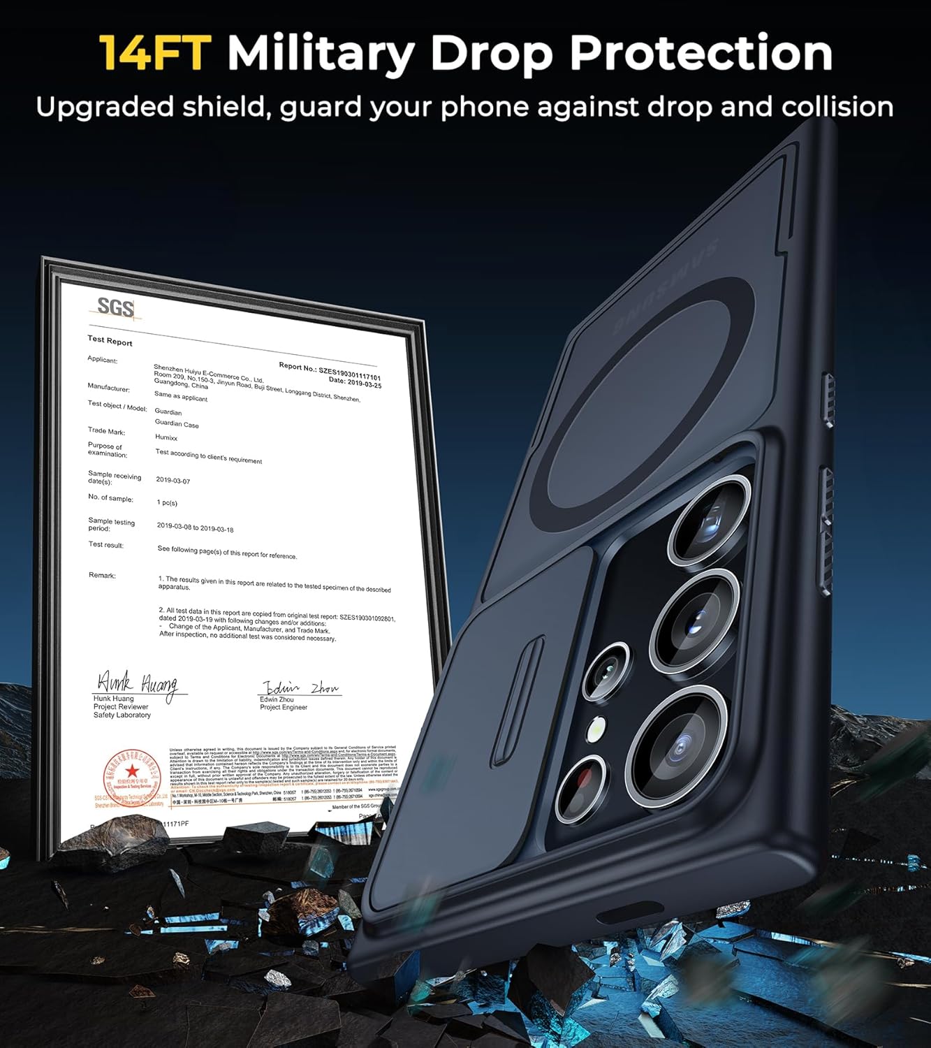 【14 FT Military Drop Protection】The Humixx Galaxy S24 Ultra case surpasses military standards (MIL-STD-810G 516.6), withstanding over 8,000 drops from 14 FT. The robust combination of a hard PC back and soft TPU bumper forms a dual-layer defense, dispersing 99% of impact forces. The case also sports a 1.5mm raised bezel for screen armor and a 2.5mm lens guard, ensuring comprehensive protection that keeps your phone in pristine condition, even when slid on flat surfaces.