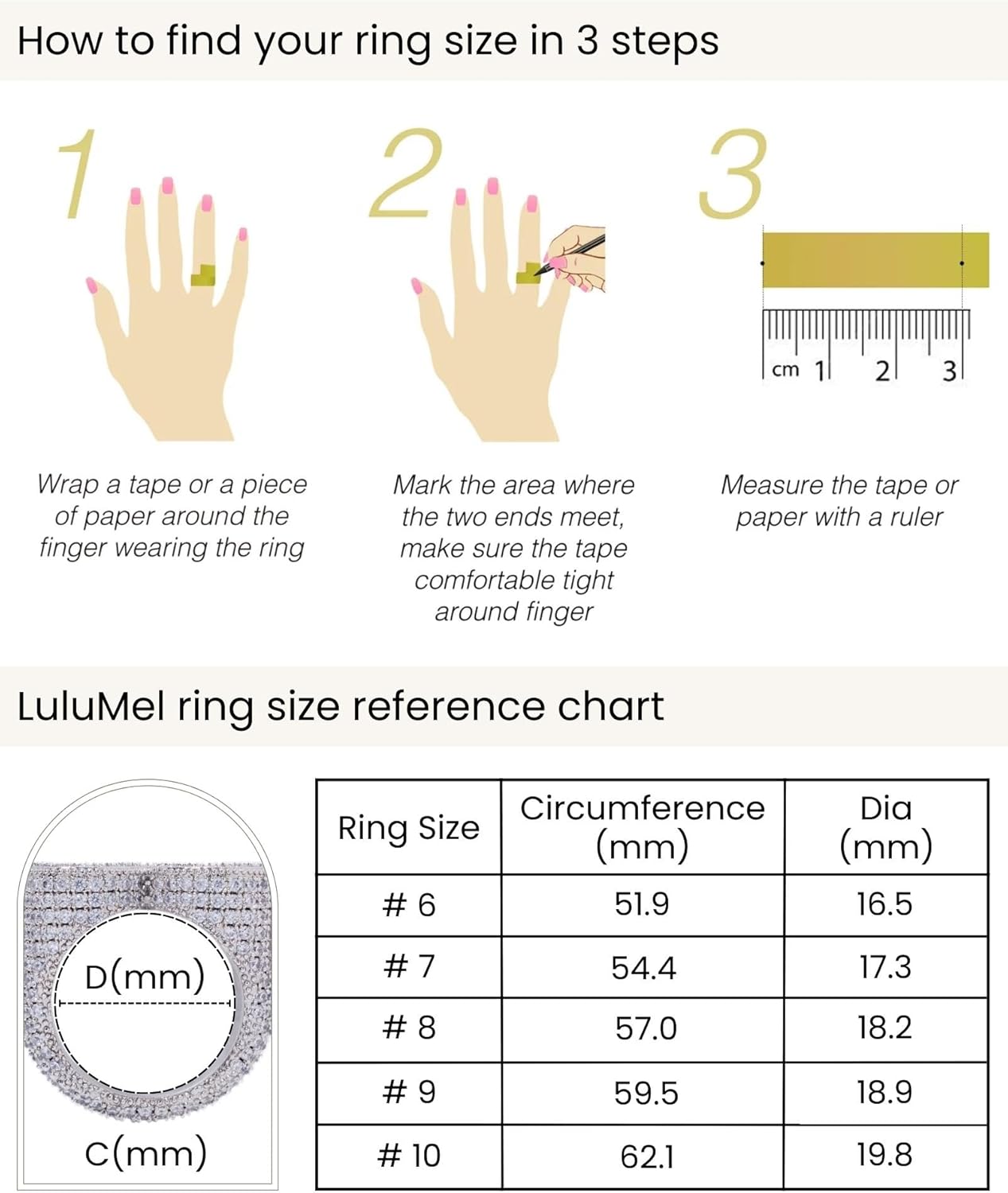 Ring Size Selection Guide Step 1: Wrap a step or a piece of paper around the finger wearing the ring Step 2: Mark the area where the two ends meet, make sure the tape comfortable tight around finger Step 3: Measure the tape or paper with a reler Step 4: Write down your finger data and refer to the ring sizing chart to choose the right ring