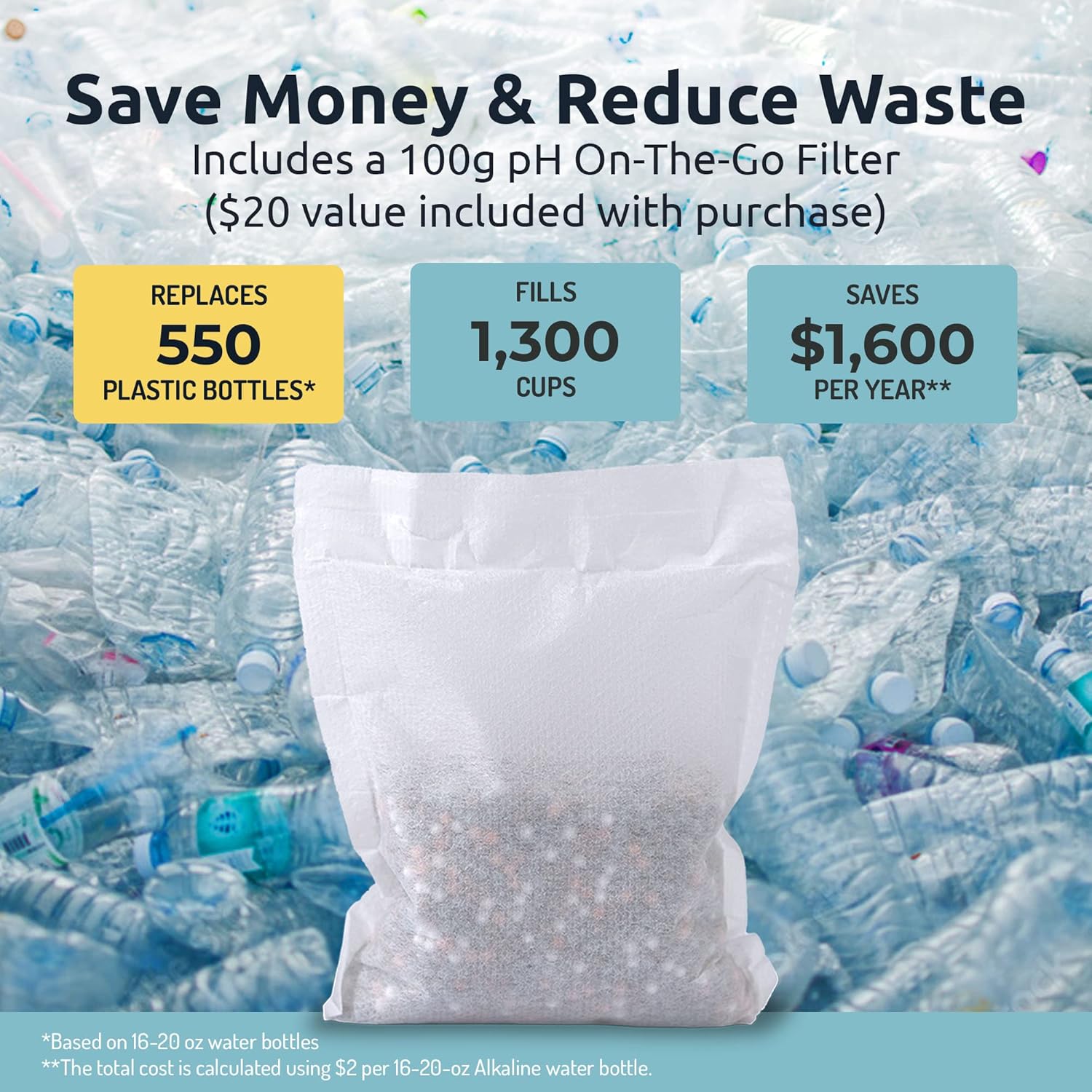 LONG-LASTING FILTER CAPACITY – Each pH alkaline pitcher can filter up to 1.8L of water at a time, ideal for home & office. Its on-the-go filter pouch lasts up to 400L/105 gal of water.