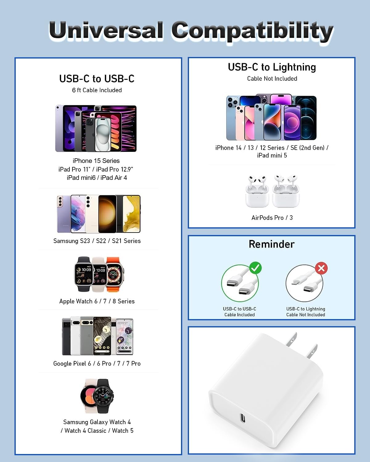 【What You Get】2-Pack 20W USB C Wall Charger, 2-Pack 6ft USB-C to USB-C Cable, 24-month warranty, and our friendly customer service. If you have any questions, don’t hesitate to contact us.We promise to solve your problems within 24 Hours.