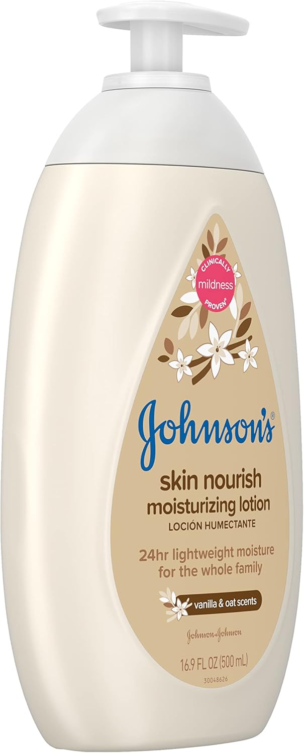 Johnson’s Baby Skin Nourish Moisturizing Baby Lotion for Dry Skin with Vanilla & Oat Scents, Gentle & Lightweight Body Lotion for The Whole Family, Hypoallergenic, Dye-Free, 16.9 fl. oz