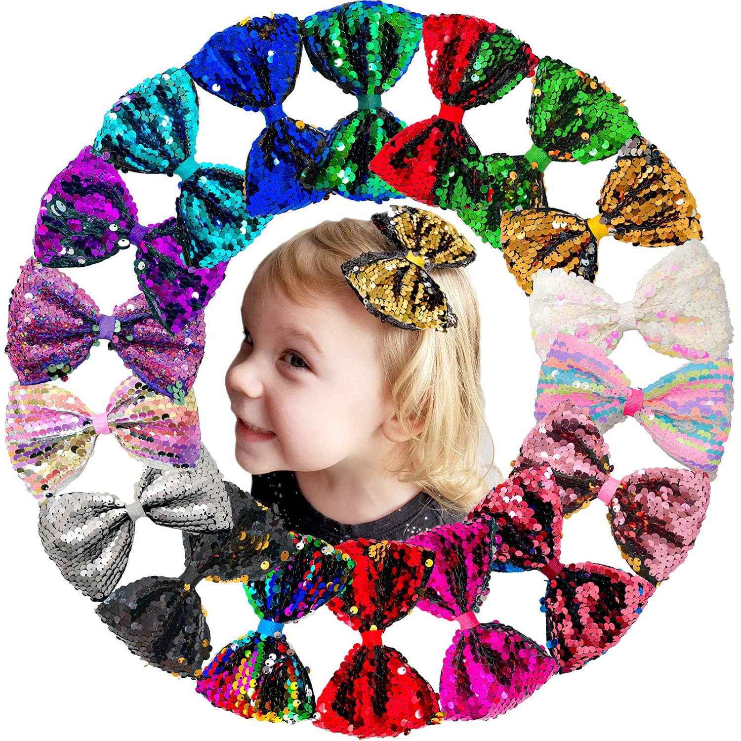 Original price was: $14.99.$10.99Current price is: $10.99.JOYOYO 18 Colors Bling Sparkle Glitter Festive Big 5 Inches Reversible Sequins Rainbow Ribbon Hair Bows Alligator Clips for Baby Girls Toddlers and Kids