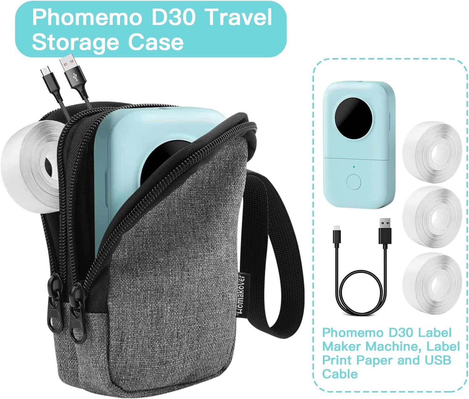 【High Capacity】Phomemo thermal printer case with two pockets can store more spare D30 thermal label tapes rolls, charging cables, so you don’t have to worry about finding your d30 label making tape