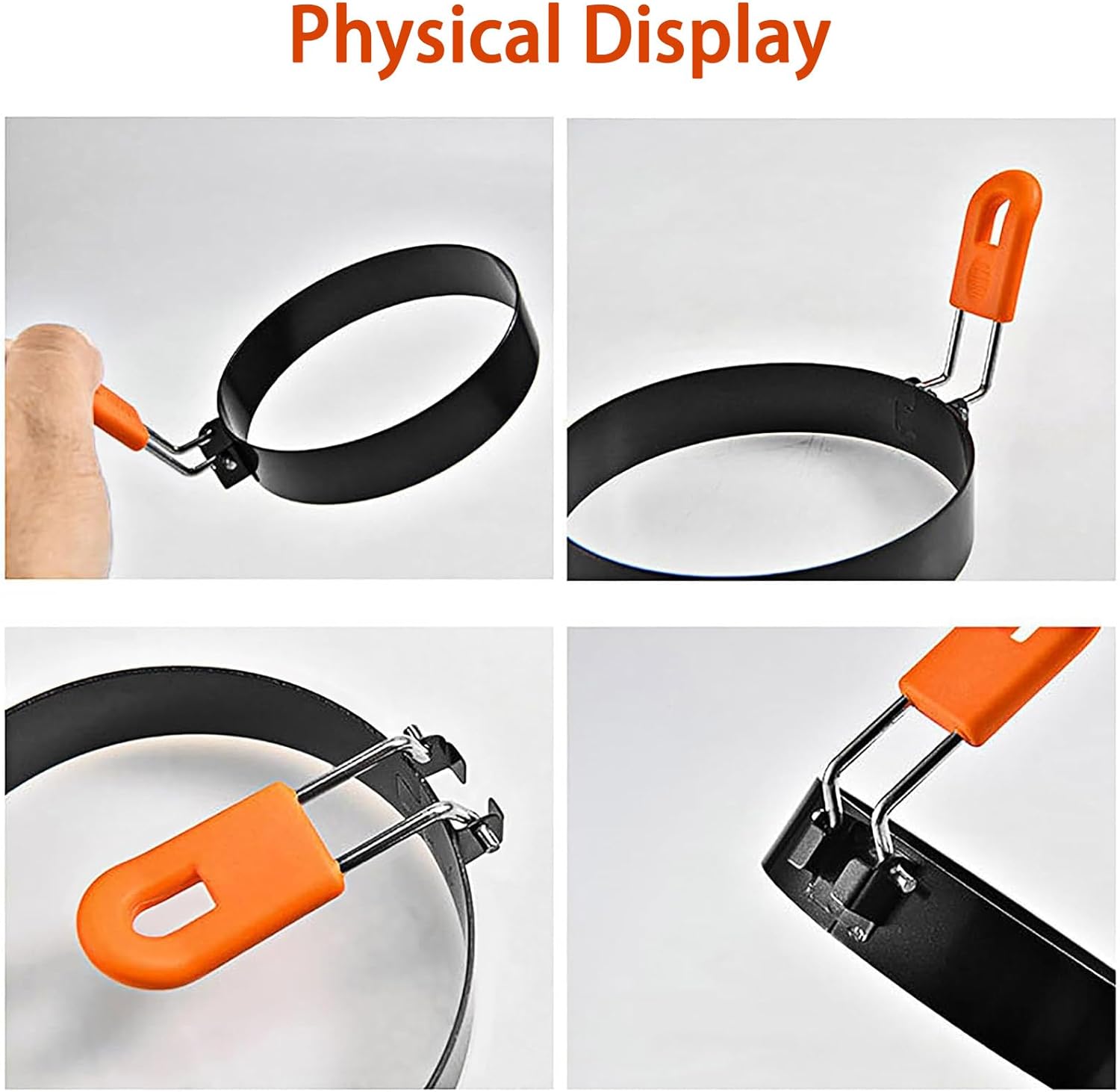 【Omelet Ring With Silicone Insulated Handle】handle of the egg ring is made of quality silicone material,silicone handle design protects your hands from burns and is easy to hold,soft and comfortable to hold, wear and tear resistant,handle can be folded for easy storage.