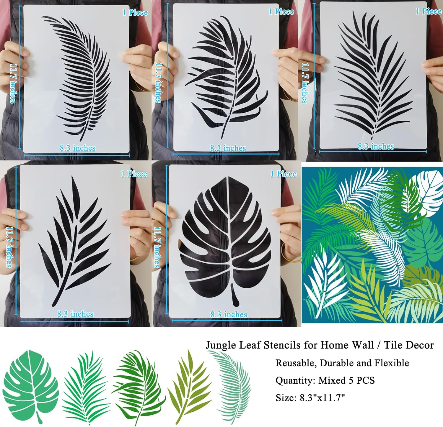 5 Pieces Mixed Tropical Jungle Leaf Stencils for Painting on Walls, Paper, Fabric, T-shirt