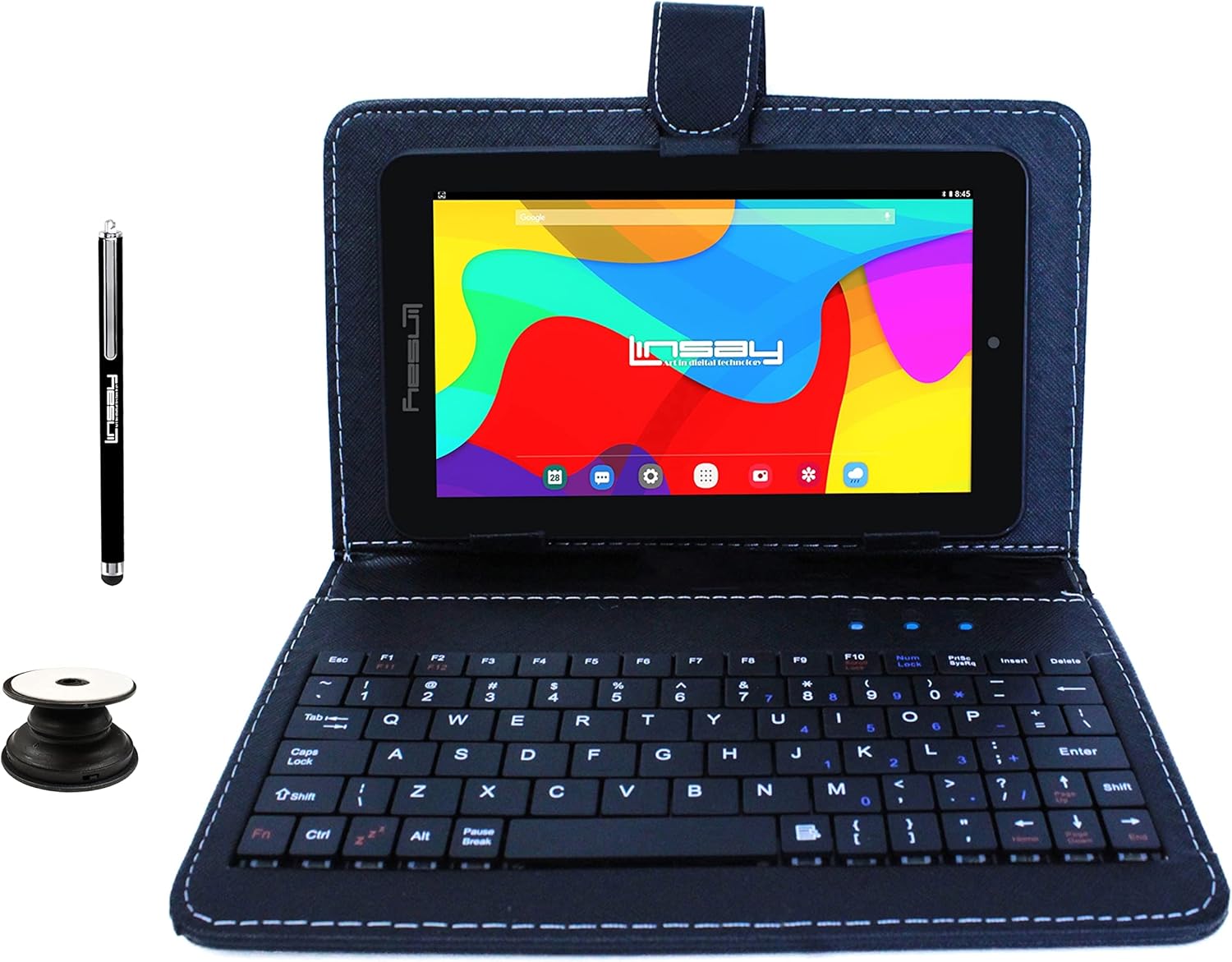 Meet the New 7 in. LINSAY Quad Core Processor 2GB RAM 32GB Storage 1024×600 HD Screen High Resolution Tablet Exclusive Bundle with Black Leather Keyboard, Pop Holder, Pen Stylus and Newest Google Android OS 12 Keeps You in Touch. Stay connected with the easy-to-use LINSAY Quad Core 7 in. capacitive tablet bundle with Google Android 12. This high-tech tablet is a flexible and powerful mobile Internet solution. Multi-task with the 7 in. Capacitive 1024×600 Touch Screen and Android 12 Operating System along with 32GB Internal Memory and customize your home screen with favorite games, social media tools, productivity apps and more. You’ll find that the 7 in. tablet bundle Google Android OS 12 makes staying connected a snap. Email, browse the web and reach out to friends and family no matter where you are, right from your hand-held device. Capture and share all of life’s best moments with the tablet’s built-in Front and Rear Camera. Listen to your favorite music or watch TV and movies with clear audio through built-in stereo speakers. No matter how you choose to use your device, you’ll find this tablet offers a powerful solution for both productivity and entertainment.