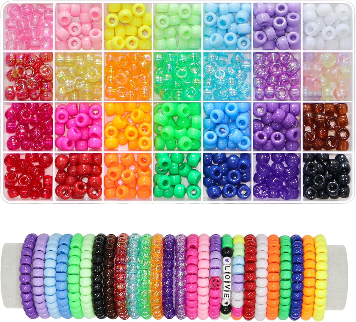 【Standard Size】The pony beads are approximately 6x9mm, while the letter beads and heart beads are 6x6mm, with a hole diameter of 4mm. Each type of bead is separately stored in individual grid plastic boxes, making storage and carrying convenient.