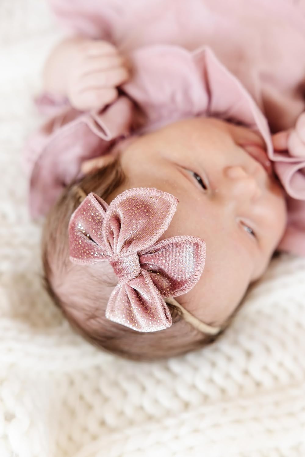 Mini bows come on a nude, nylon headband that’s soft enough to comfortably fit your newborn and stretchy enough to fit an adult.