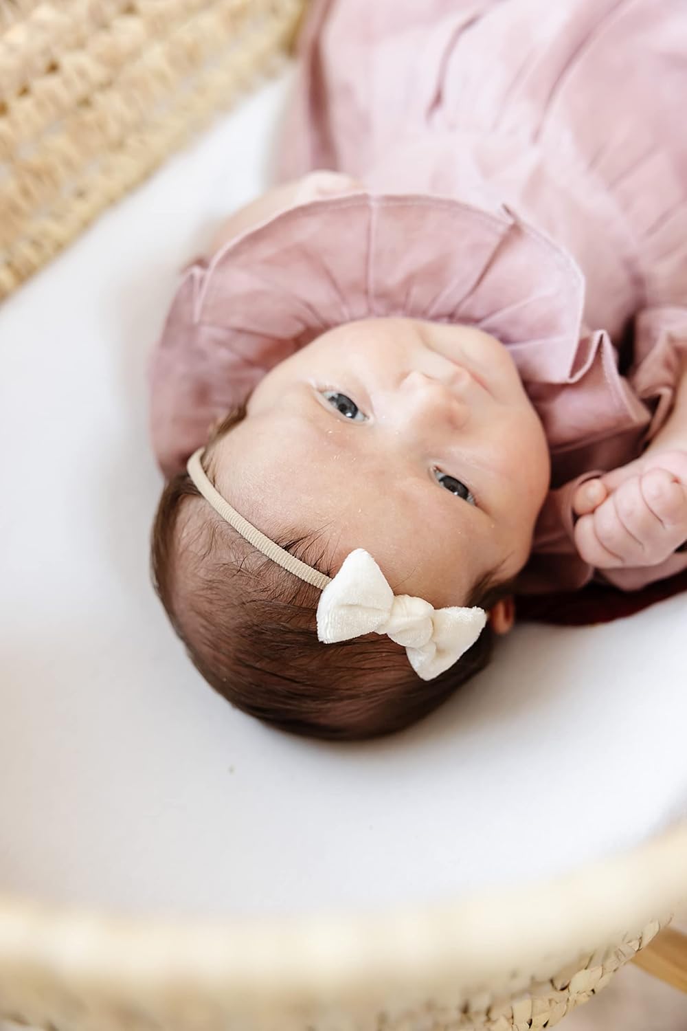 Mini bows come on a nude, nylon headband that’s soft enough to comfortably fit your newborn and stretchy enough to fit an adult.