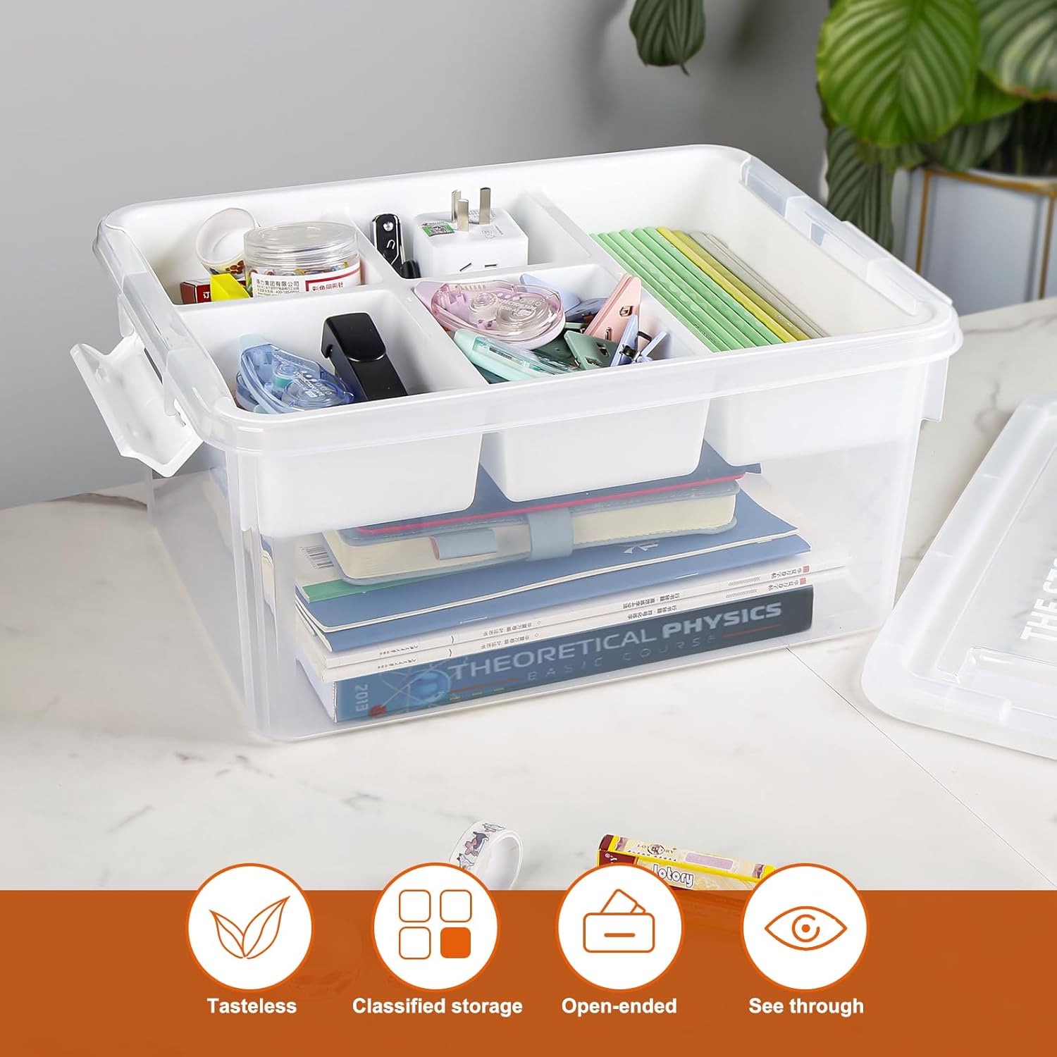 【Clear&Stackable Design】:The high transparent base and lid makes the contents of the storage organizer can be seen at a glance. The sturdy latches fasten the storage box to lock your supplies firmly and prevent dust and dirt from entering. Its shape allows you to stack easily, maximizing the effective use of vertical storage space.