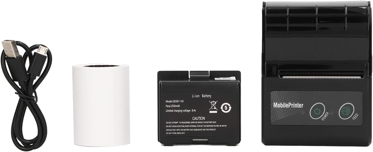 Item Type Bluetooth Receipt Printer Material ABS Battery Type Lithium Battery (Delivered with Matching Battery) Battery Capacity 1500mAh Print Resolution 200dpi Printing Speed 3 to 5 in Per Second Applicable Paper Approx. 57 x 30mm / 2.2 x 1.2in Support System for Android, for IOS, Computer Function Suitable for Taxi Order Printing, Free Receipt Printing, Food Ordering System, Office Printing