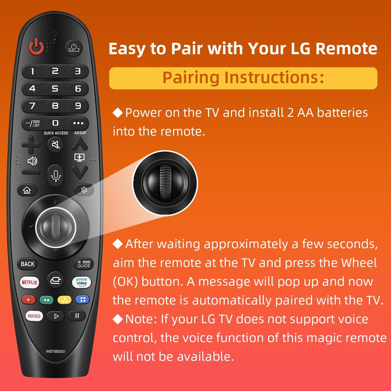 Magic Voice Remote for LG Smart TVs. Replacement LG-TV-Remote MR20GA with Voice and Pointer Function for All LG UHD OLED QNED NanoCell 4K 8K Models. WebOS ThinQ AI. 1-Year Full Warranty.