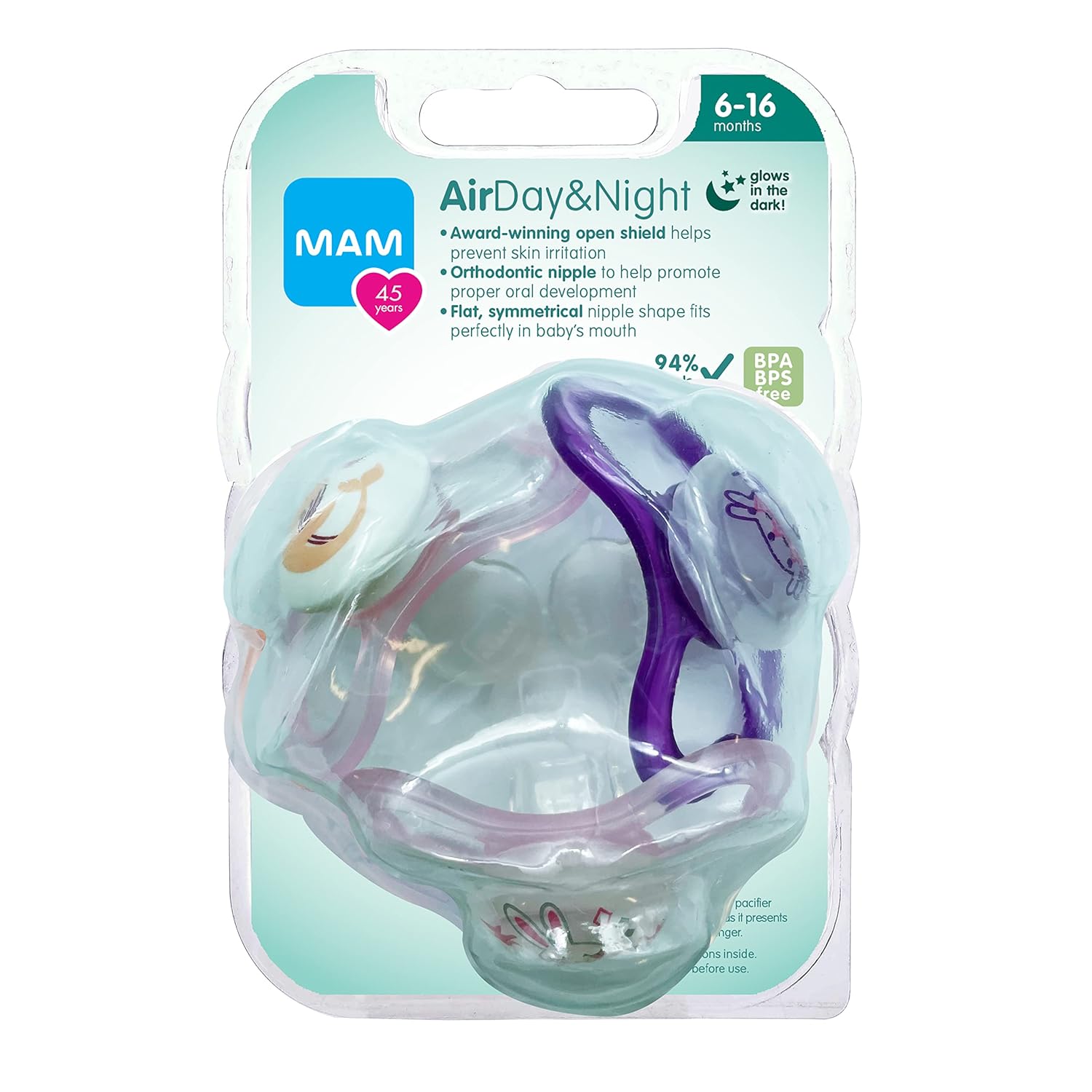 MAM Air Night & Day Baby Pacifier, for Sensitive Skin, Glows in The Dark, 3 Pack, 6-16 Months, Girl,3 Count (Pack of 1)